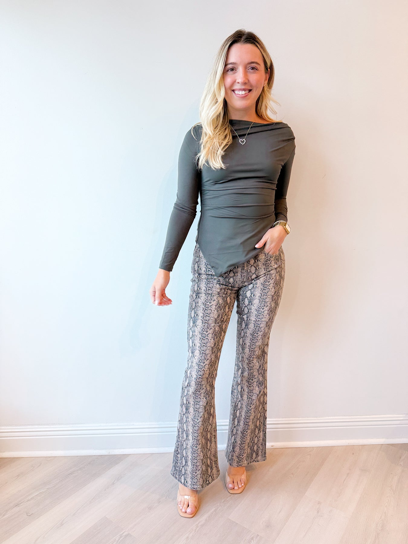 Step into bold style with our Snake Flare Denim. Featuring an eye-catching snakeskin print, these flares bring just the right amount of edge to your everyday denim lineup. The flattering fit hugs your curves before kicking out into a retro-inspired flare—perfect for pairing with boots, heels, or sneakers. A must-have statement piece for the season.