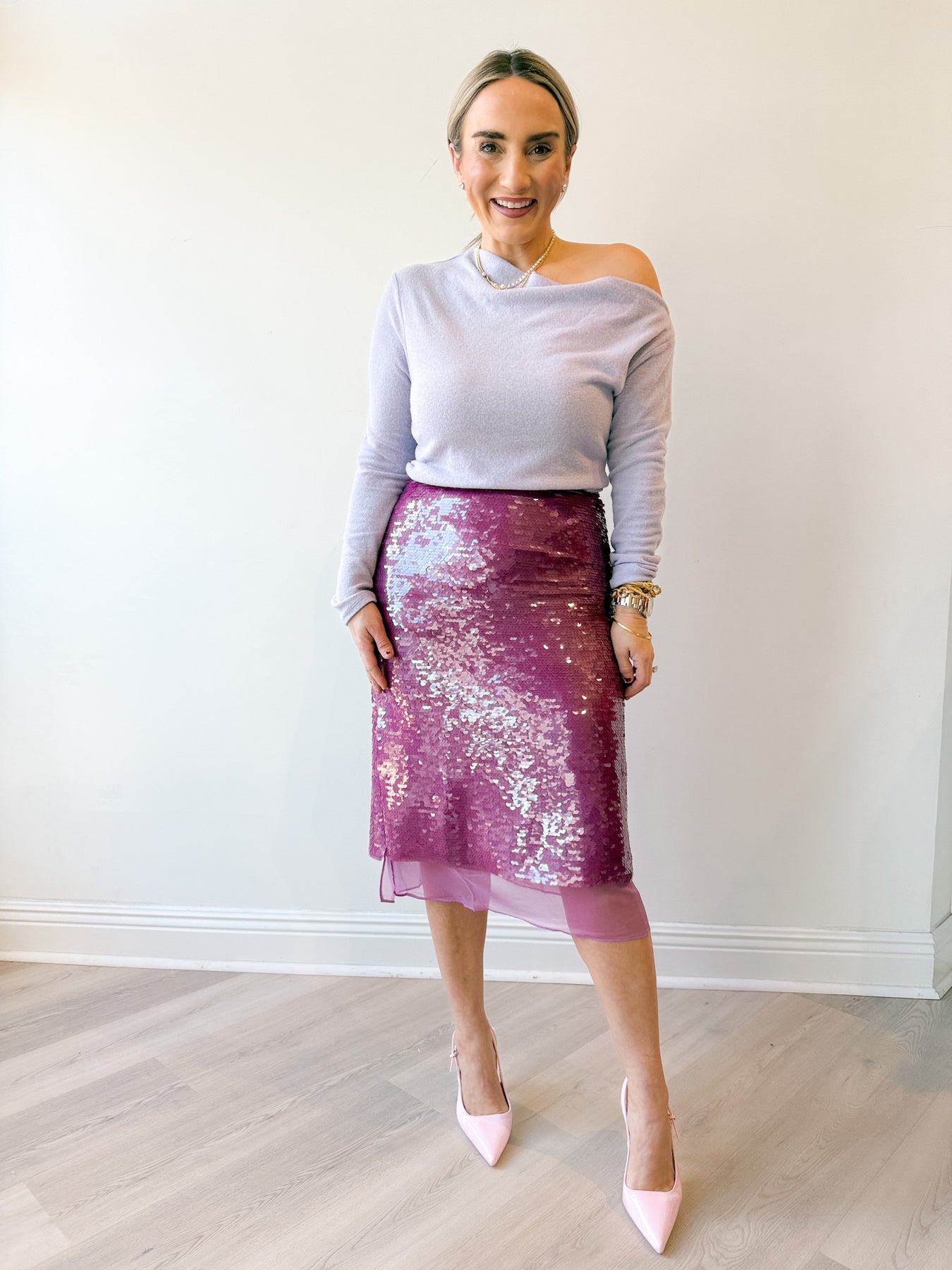 Turn every moment into a spotlight with the radiant Shirin Sequin Pencil Skirt. Covered in bold, high-shine sequins, this stunning violet skirt brings glamor and sophistication to any look. The classic pencil silhouette creates a sleek, elongated shape, while the soft chiffon hem adds a delicate, feminine finish that moves beautifully with you.