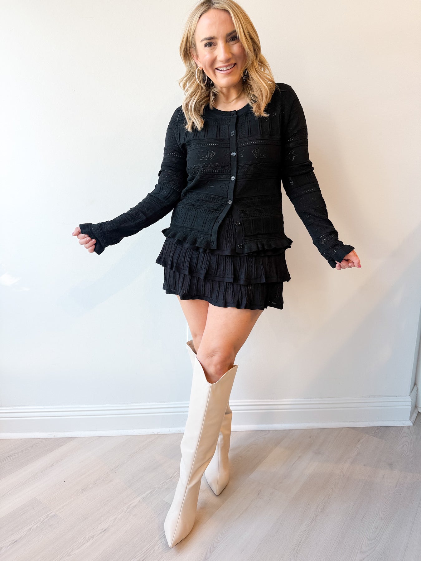 Flirty meets functional in the Hannah Mini Skort. Featuring soft knit fabric, feminine eyelet texture, and tiered ruffles for added movement, this piece brings all the charm of a mini skirt with the comfort of built-in shorts. The wide elastic waistband keeps things comfy for all-day wear—perfect for dressing up or down with your favorite sneakers, boots, or sandals.