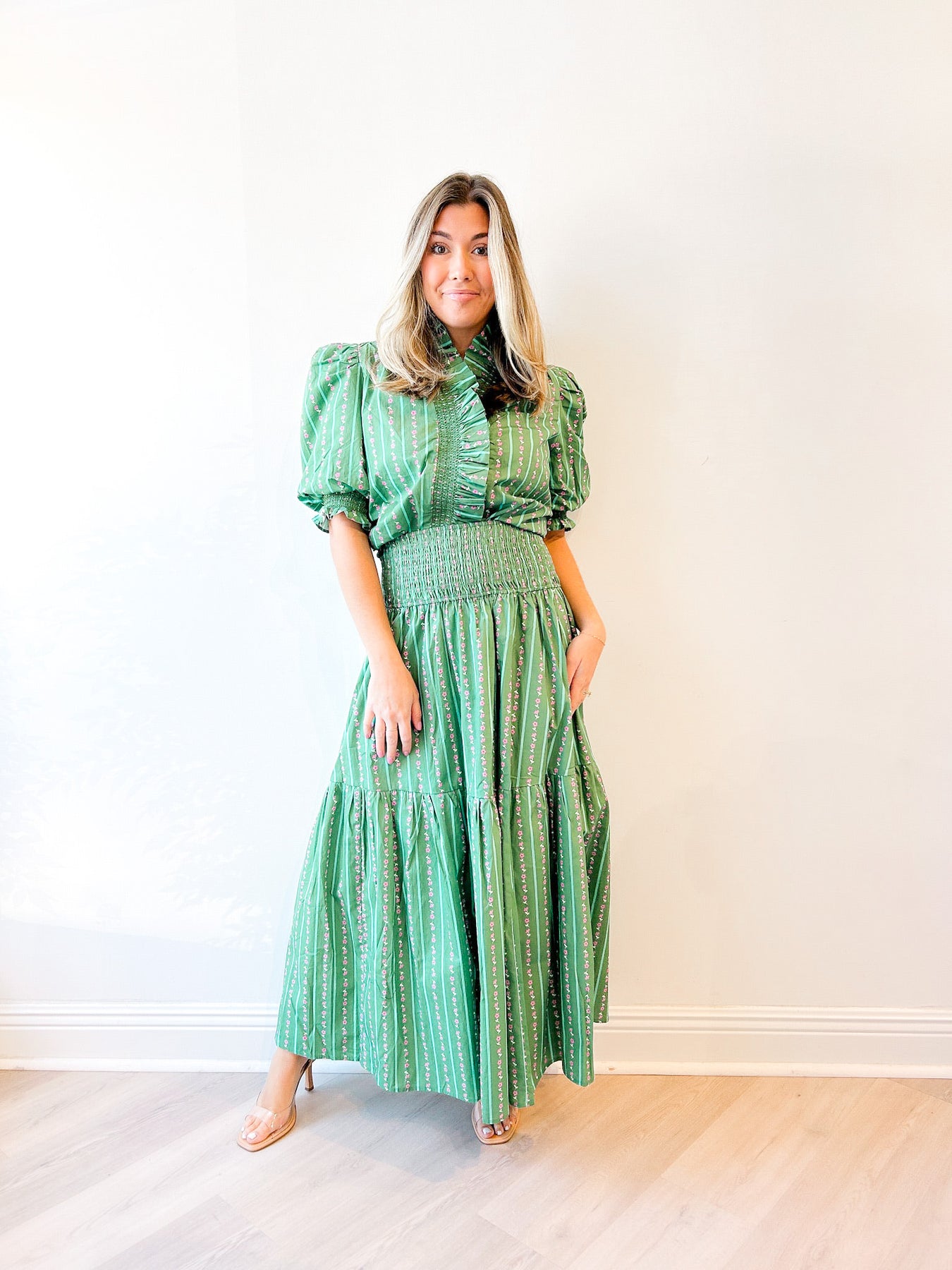 The Floral Tier Smock Maxi Skirt brings effortless charm to any day. Featuring a flattering smocked waistband and tiered silhouette, this flowy skirt moves beautifully with every step. Style it with the matching Floral Ditzy Ruffle Top for a coordinated look, or pair with a simple knit for an easy, elevated outfit.