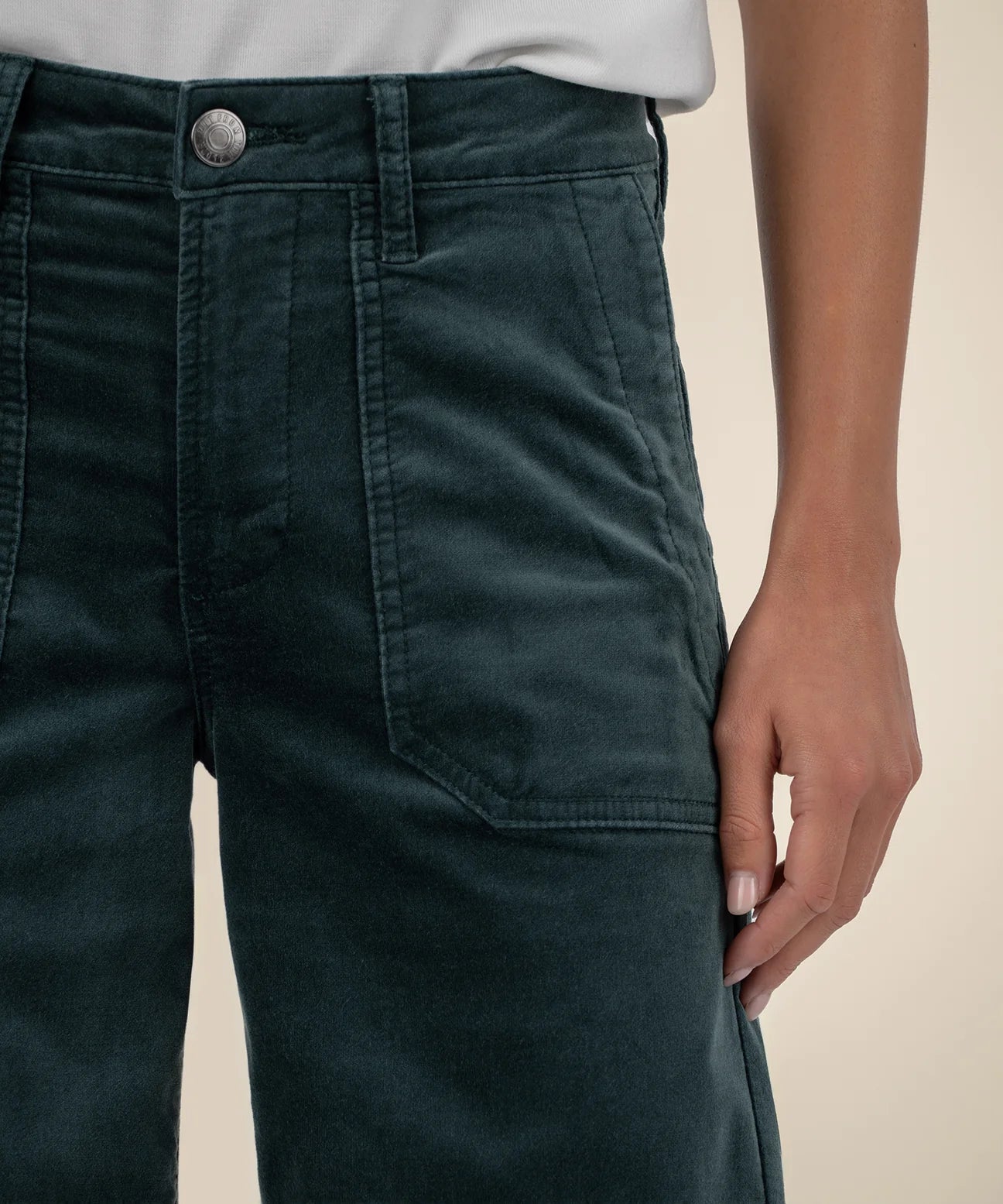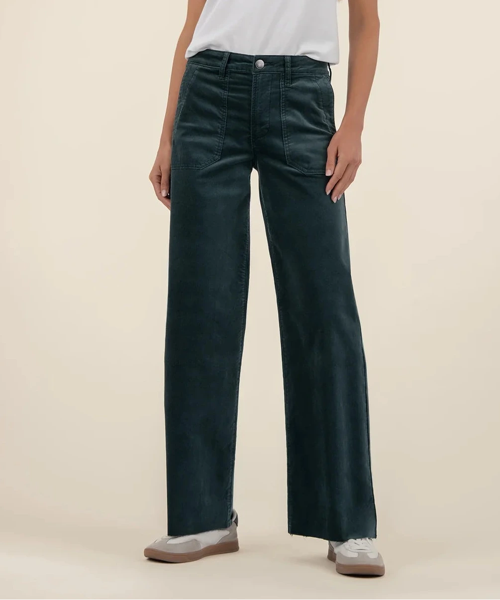 Stand out in style with these high-rise wide leg pants in a bold teal color. Designed with signature porkchop pockets, a laid-back raw hem, and made from very stretchy material, they offer the perfect mix of comfort, structure, and statement-making flair.