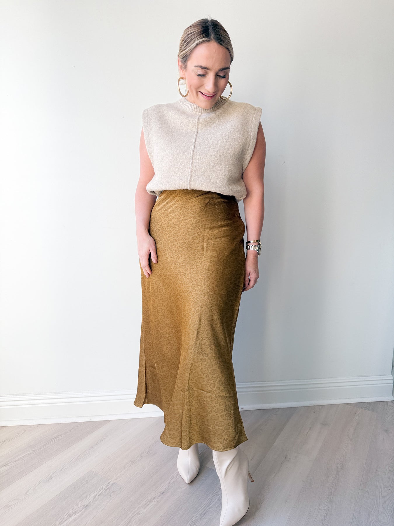 The Geauxld Midi Skirt brings a subtle statement to your wardrobe with its silky sheen and soft golden hue. Designed with a flattering bias cut and gentle drape, it moves beautifully with every step. Pair it with sweaters or sleek tops for an effortlessly chic day-to-night look.