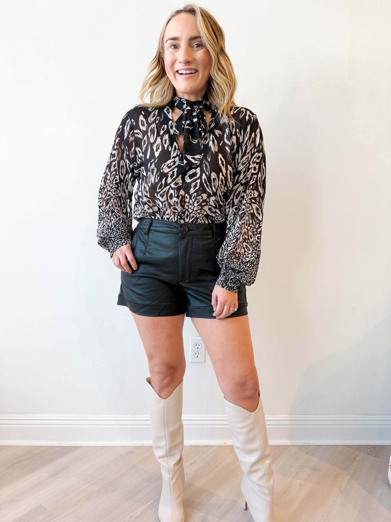 Make a bold yet effortless statement with the Faye Blouse. Designed in a sheer, flowy woven fabric with a striking black and white abstract print, this blouse features voluminous sleeves, button-up detailing, and a relaxed fit that drapes beautifully. Perfect for pairing with leather pants or denim for an elevated, artful look.