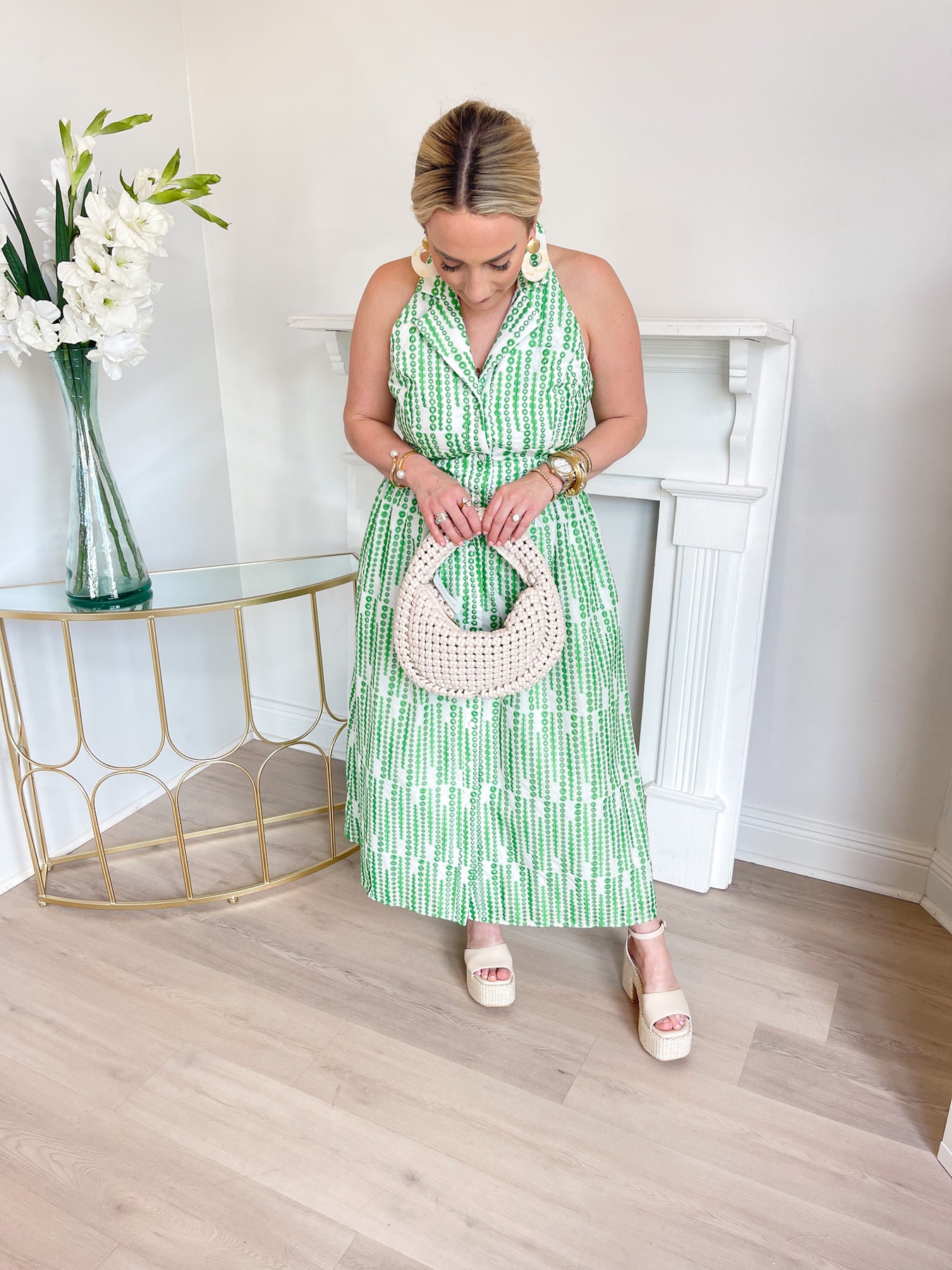 This green and white printed midi dress features a polished yet playful silhouette. Designed with a halter neckline and a structured collar, it creates a flattering, tailored look through the bodice. The dress is fitted at the waist with subtle pleating, giving it shape before flowing into a soft, tiered midi-length skirt.