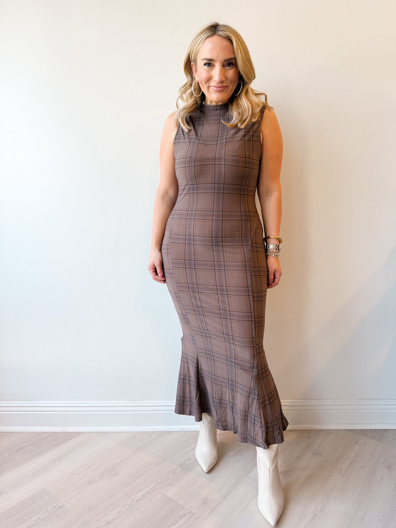 The Leigha Dress is effortless elegance with a modern, cozy twist. This fitted maxi dress features a warm brown plaid print that feels chic, seasonal, and timeless. The mock neckline adds a polished, elevated touch, while the curve-skimming silhouette flatters beautifully without feeling tight.