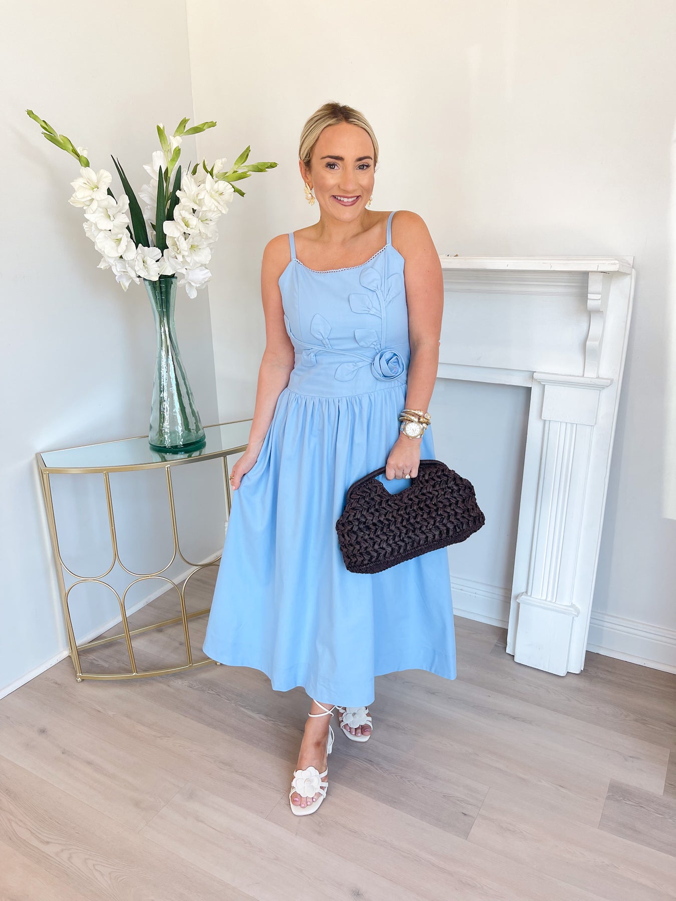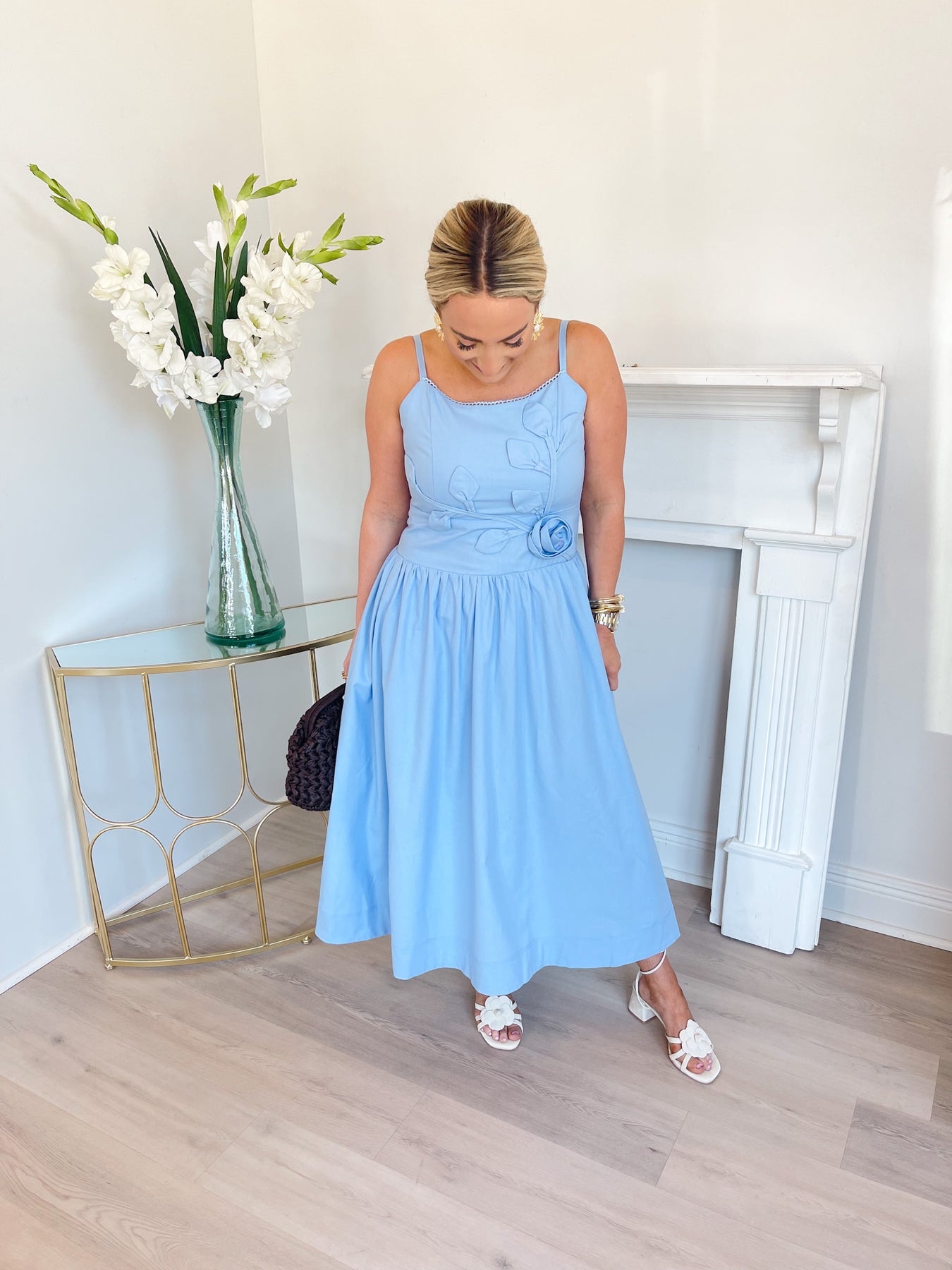 A soft blue midi dress featuring delicate spaghetti straps and a gently curved neckline for a feminine, elegant look. The fitted bodice is accented with subtle floral appliqué details and a coordinating fabric rosette at the waist, adding romantic texture. It flows into a light, gathered skirt with graceful movement, making it a beautiful choice for showers, brunch, or spring events.