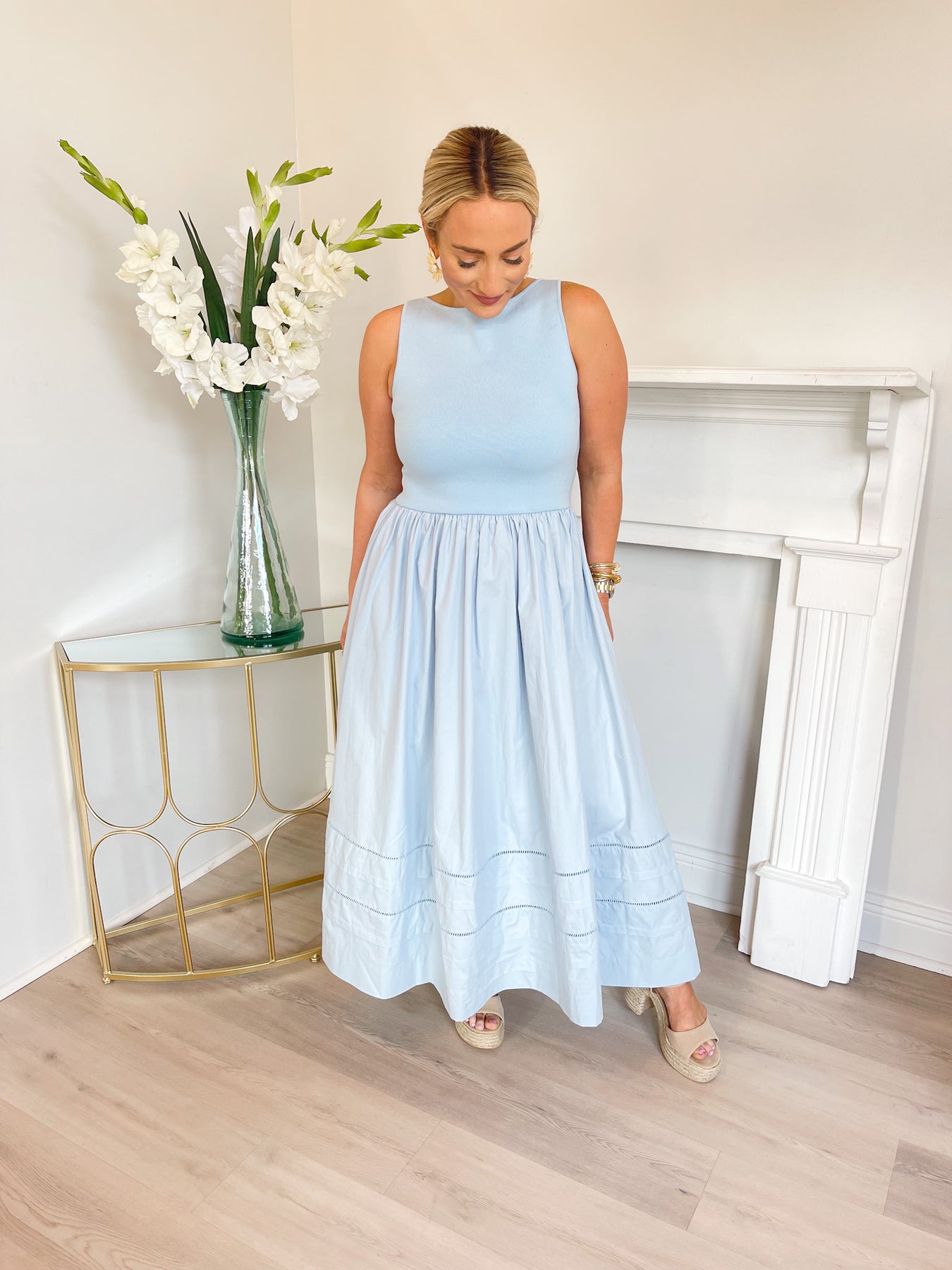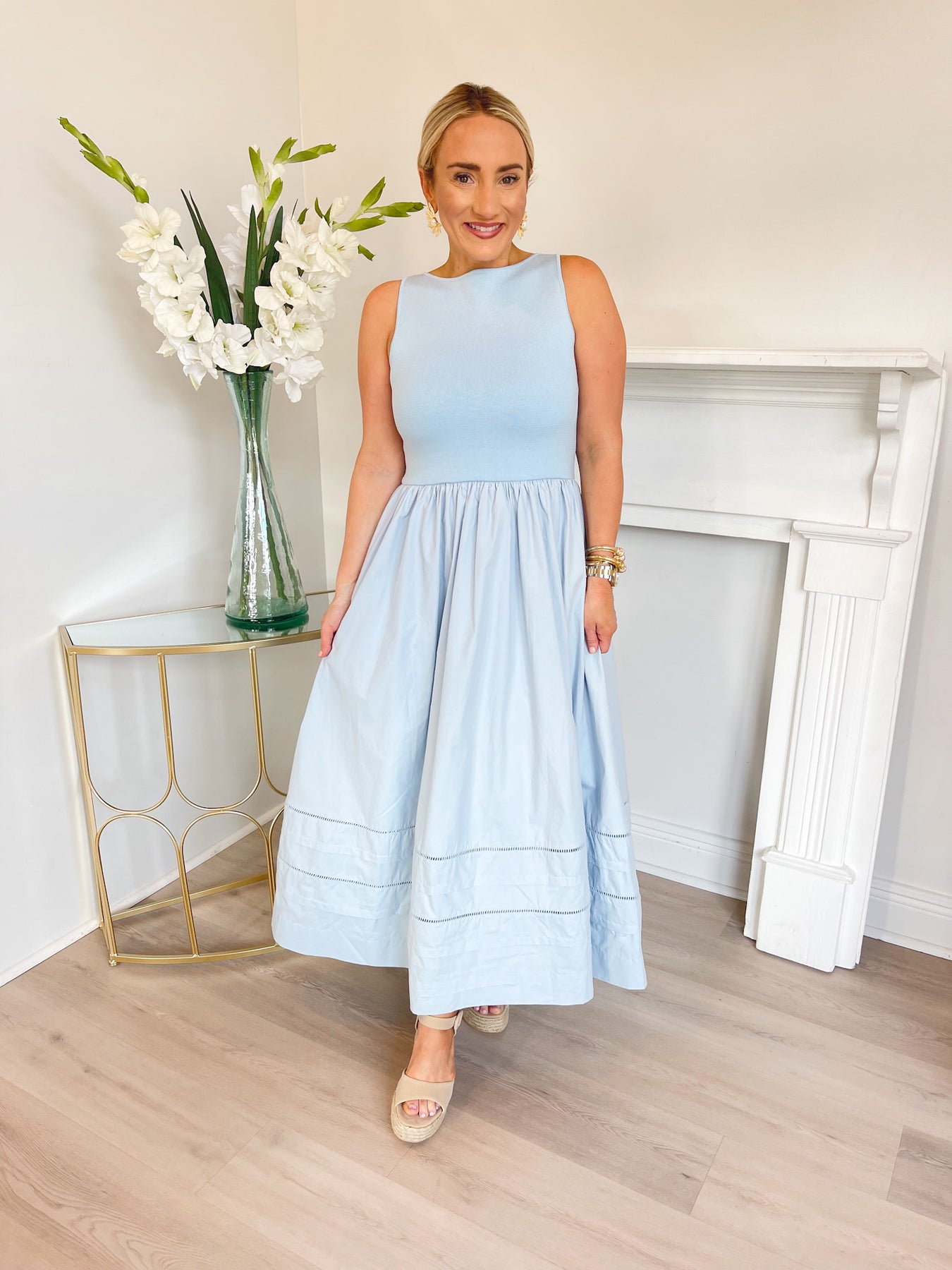 A soft blue midi dress featuring a sleek sleeveless bodice with a high neckline for a clean, polished look. The fitted top flows into a gathered, full skirt that creates beautiful movement and an elegant silhouette. Finished with subtle stitched detailing along the skirt, this feminine piece is perfect for brunch, showers, or spring events.