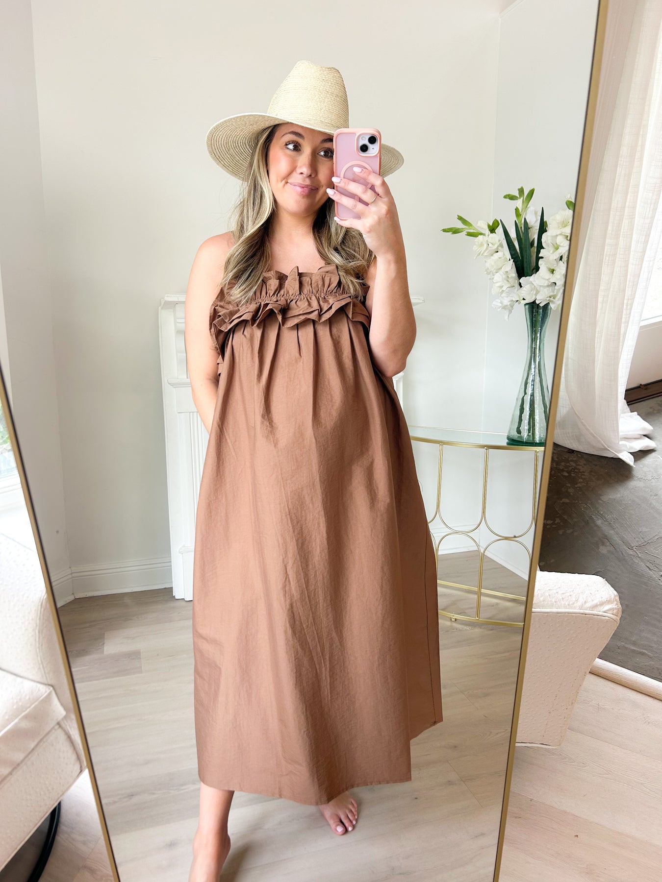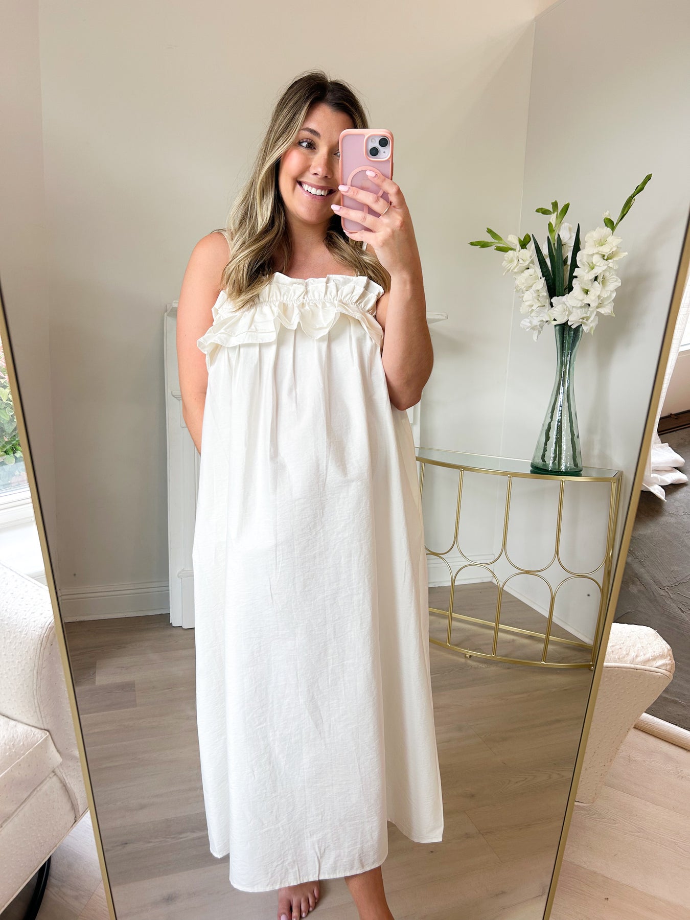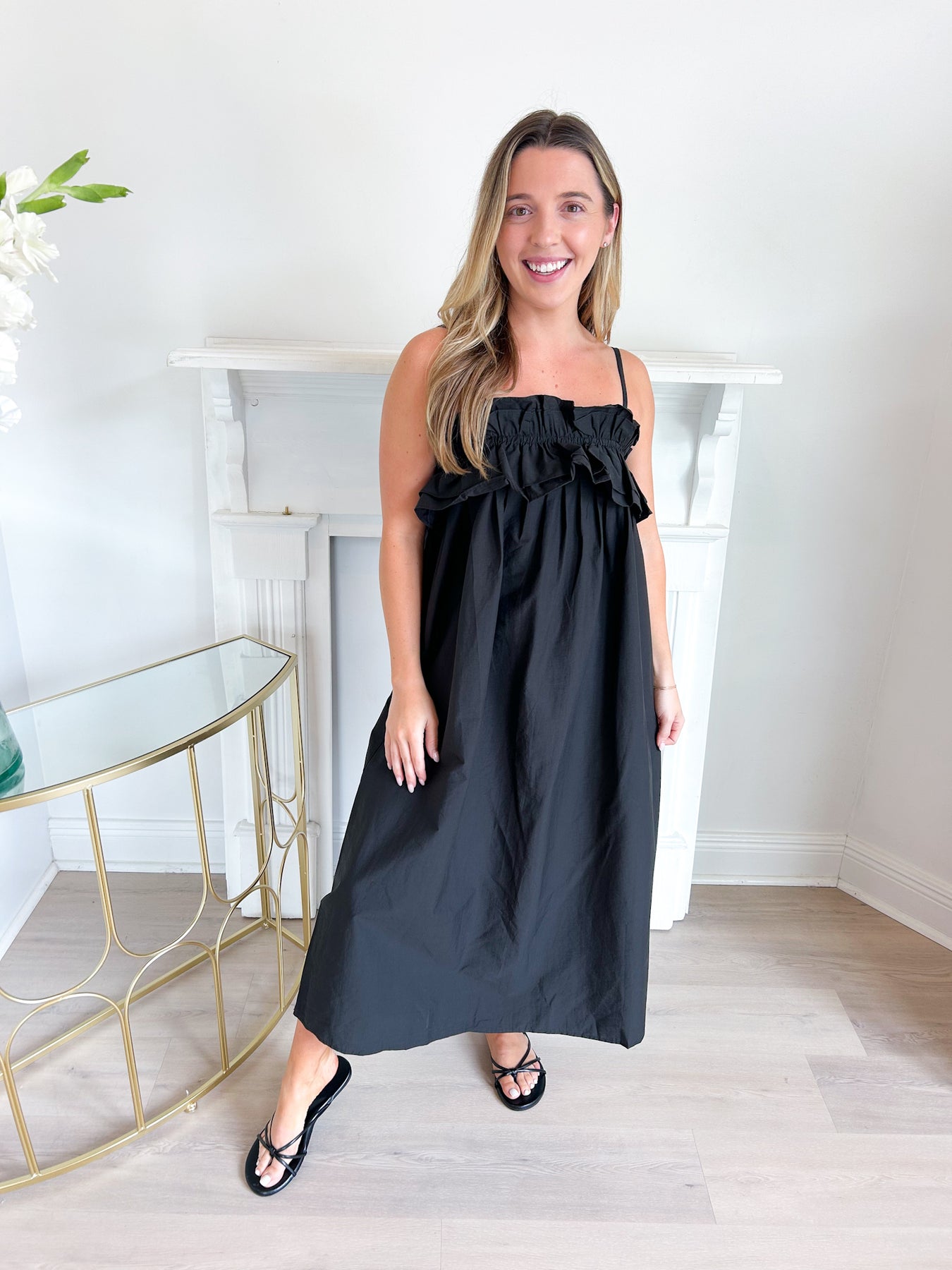 Flouncy and flirty midi dress with gorgeous ruffle detail at the top! Adjustable spaghetti straps and an elastic top hem.