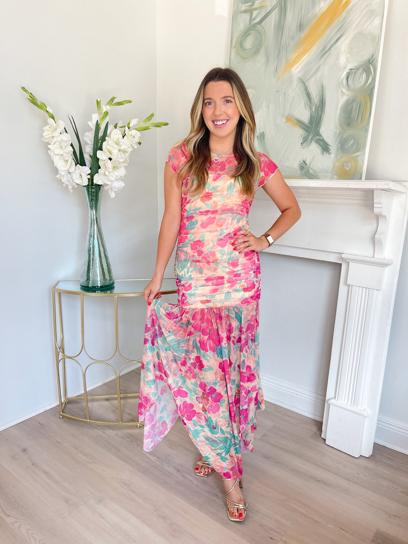 This dress is a romantic, floral maxi with a soft, feminine feel. It features a fitted, ruched bodice that hugs the waist and hips, paired with a sheer mesh overlay that creates a flattering, slightly sculpted silhouette. The cap sleeves and high neckline add a polished touch, while the lightweight fabric keeps it airy and comfortable.