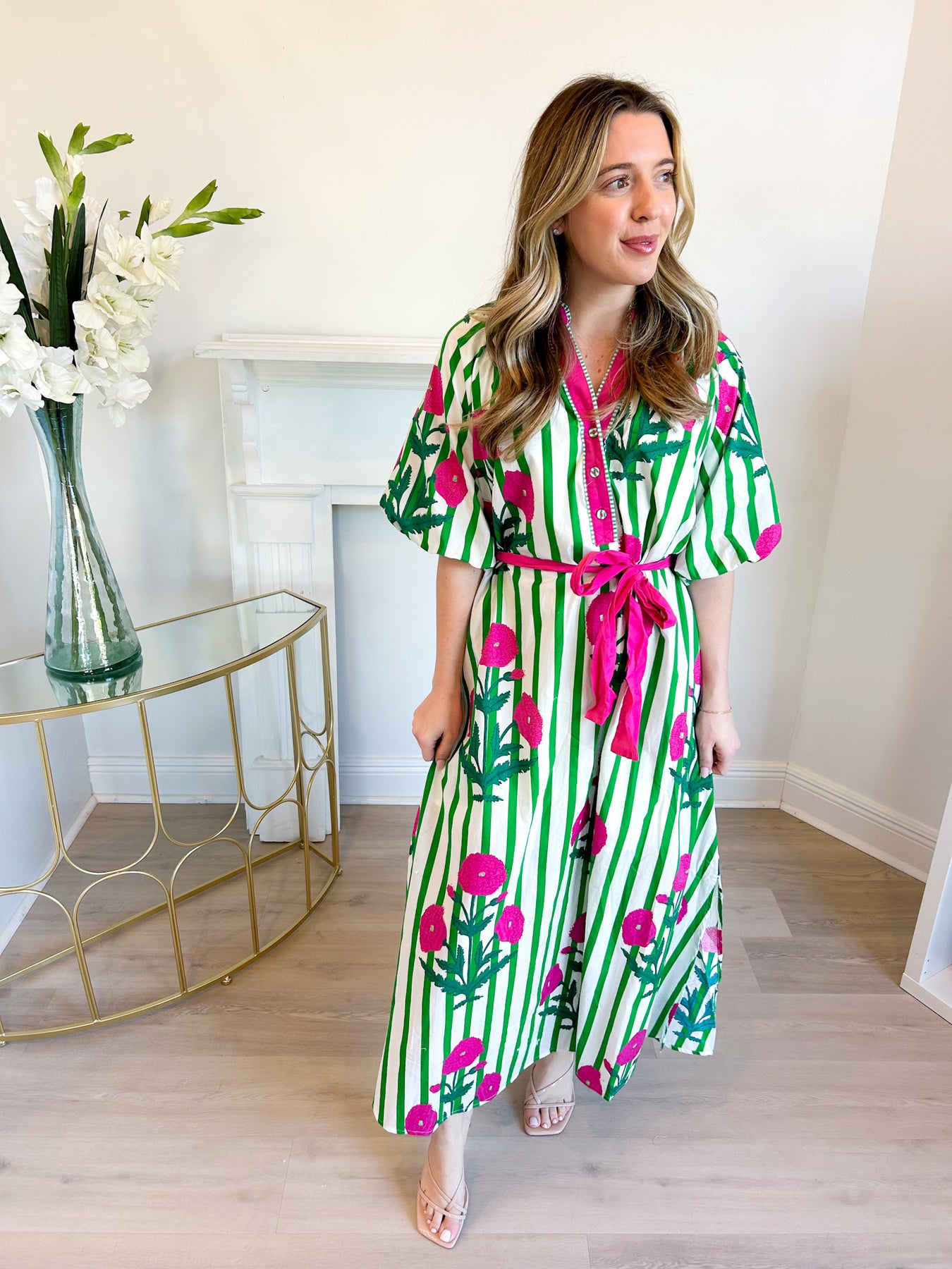 Meet your new statement-maker. This eye-catching maxi dress features bold green-and-white vertical stripes accented with vibrant pink floral motifs for a fresh, playful feel. Designed with a relaxed silhouette, it has elbow-length puff sleeves, a flattering V-neckline with decorative button detailing, and a removable pink self-tie belt to cinch the waist just how you like it. The lightweight fabric flows beautifully, making it perfect for brunch dates, vacations, garden parties, or anytime you want to stand out effortlessly.