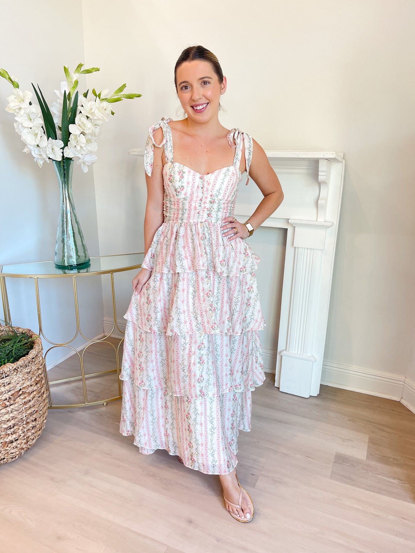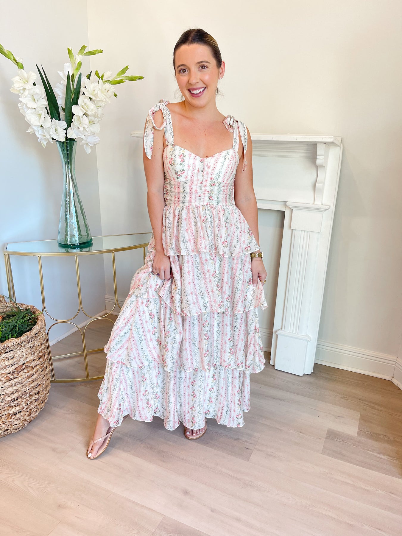 This dress is a romantic, vintage-inspired midi with soft, feminine charm. It features a structured, corset-style bodice with delicate ruching and a flattering sweetheart neckline, complemented by adjustable tie straps for a dainty, customizable fit. The fabric showcases a subtle mix of pastel florals and vertical stripe detailing, giving it a timeless, heirloom feel.