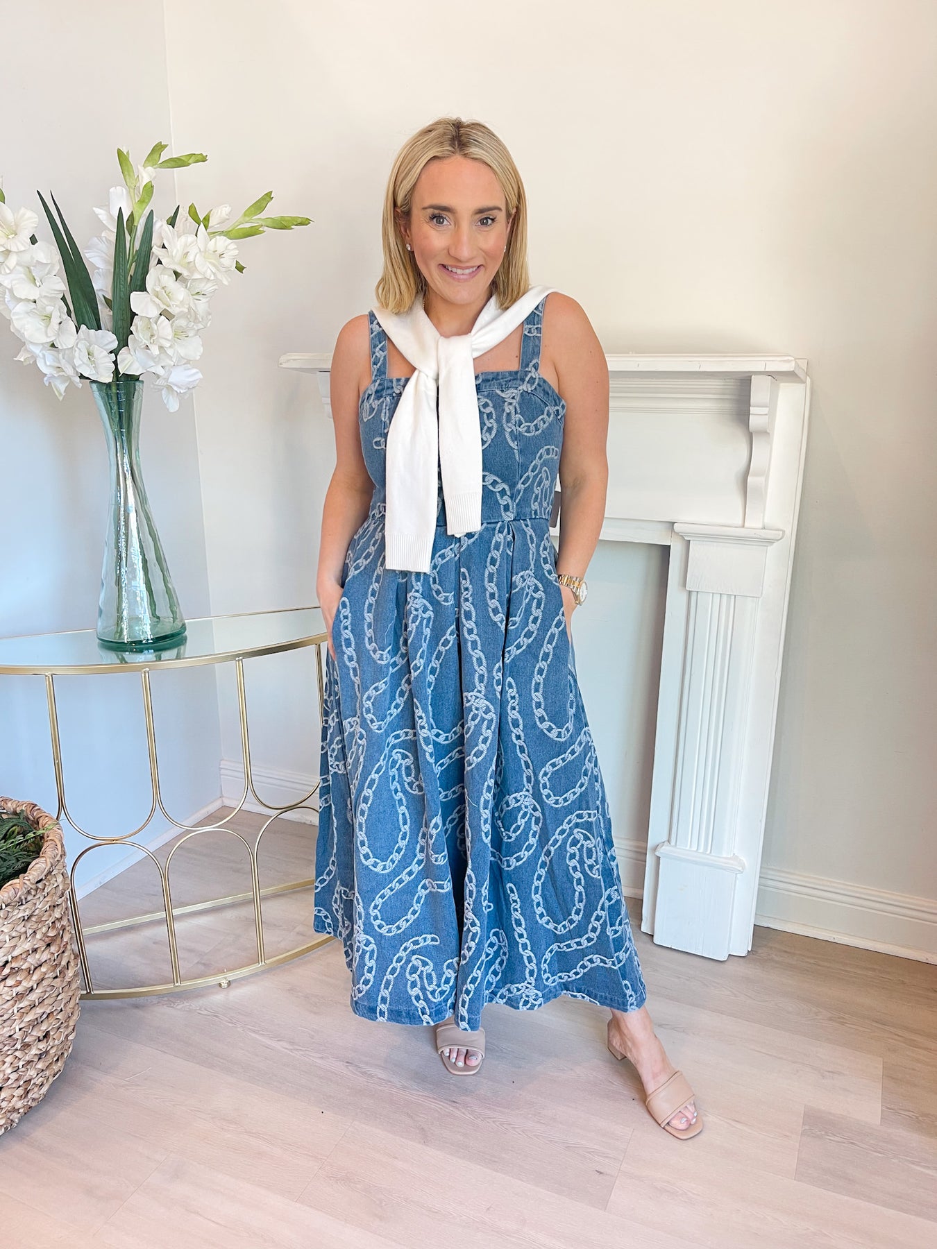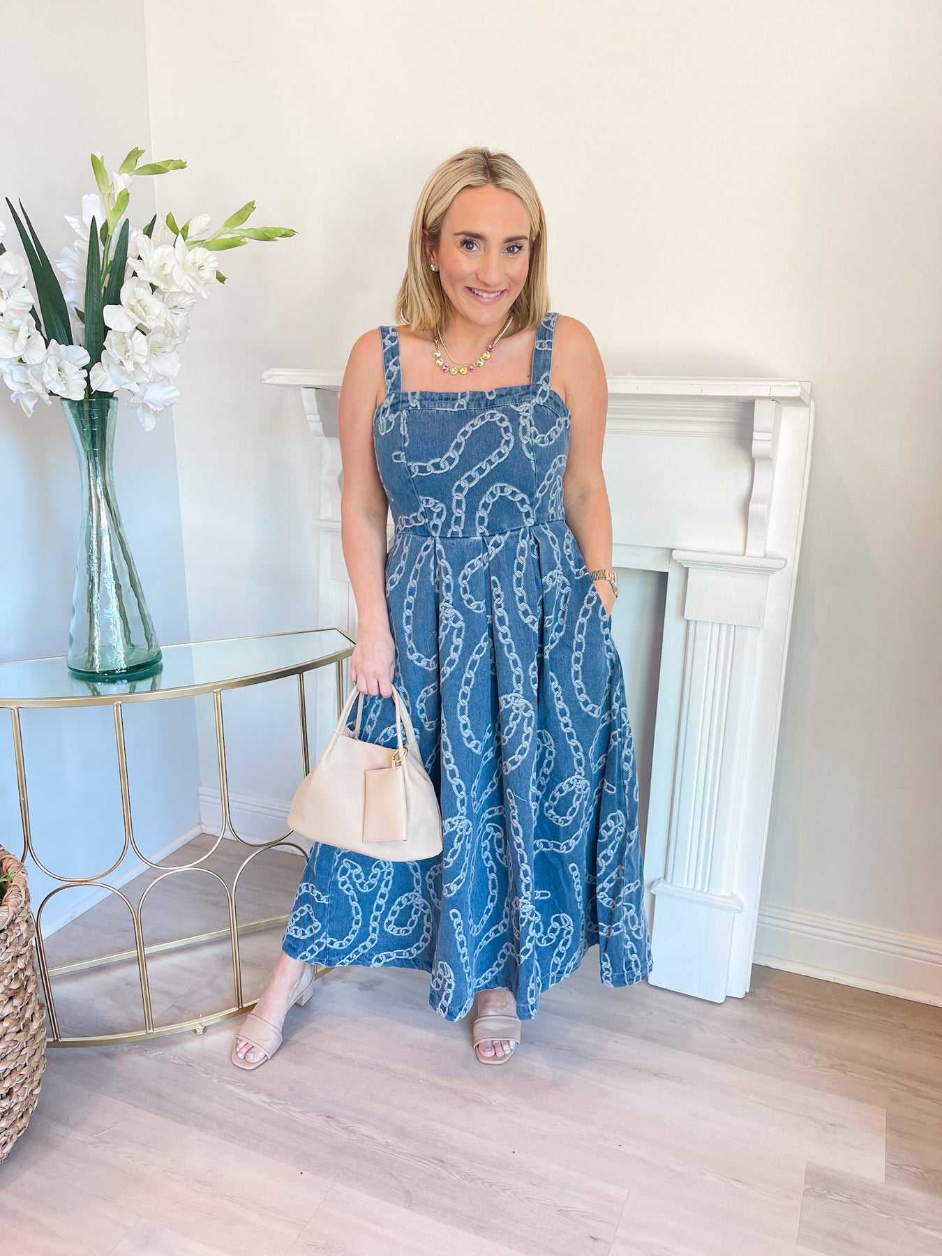 This dress is a charming, denim-toned midi with a playful yet polished feel. It features a structured square neckline with wide straps and a fitted bodice that flatters through the waist before flowing into a full, A-line skirt. The standout detail is the soft white chain-link pattern throughout, adding a touch of visual interest and a slightly nautical vibe. Side pockets bring a casual, functional element, while the midi length keeps it effortlessly elegant. Perfect for brunch, showers, or daytime events, it’s a versatile piece that blends classic structure with a fun print.