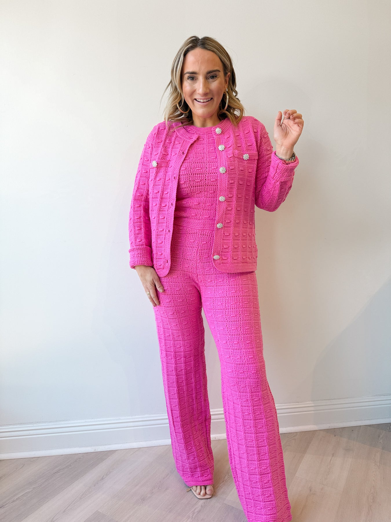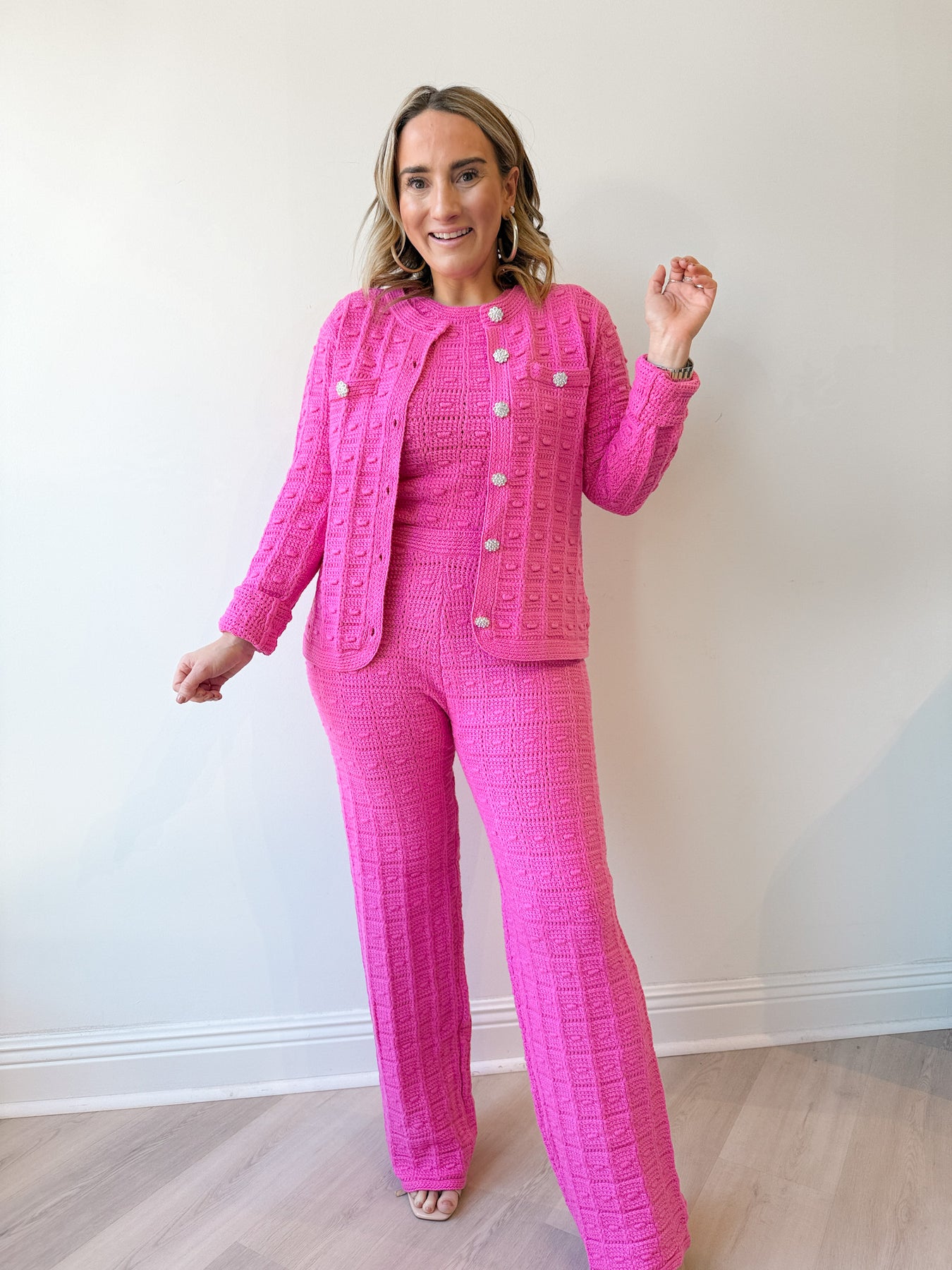 The Shanel Boxy Cardigan brings classic elegance with a modern twist. Designed in a bold pink knit with pearl-accent buttons and a structured silhouette, it’s the perfect layering piece to elevate your basics—or pair with the matching knit pant set for a polished, head-to-toe look.