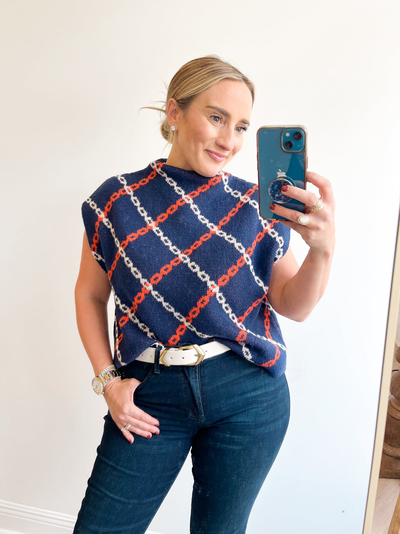 Bold and modern, this sleeveless knit features a striking chain-link pattern in rich navy, red, and ivory. With its relaxed fit and elevated design, it’s the perfect piece to pair with denim, trousers, or layer under a blazer for a statement look.