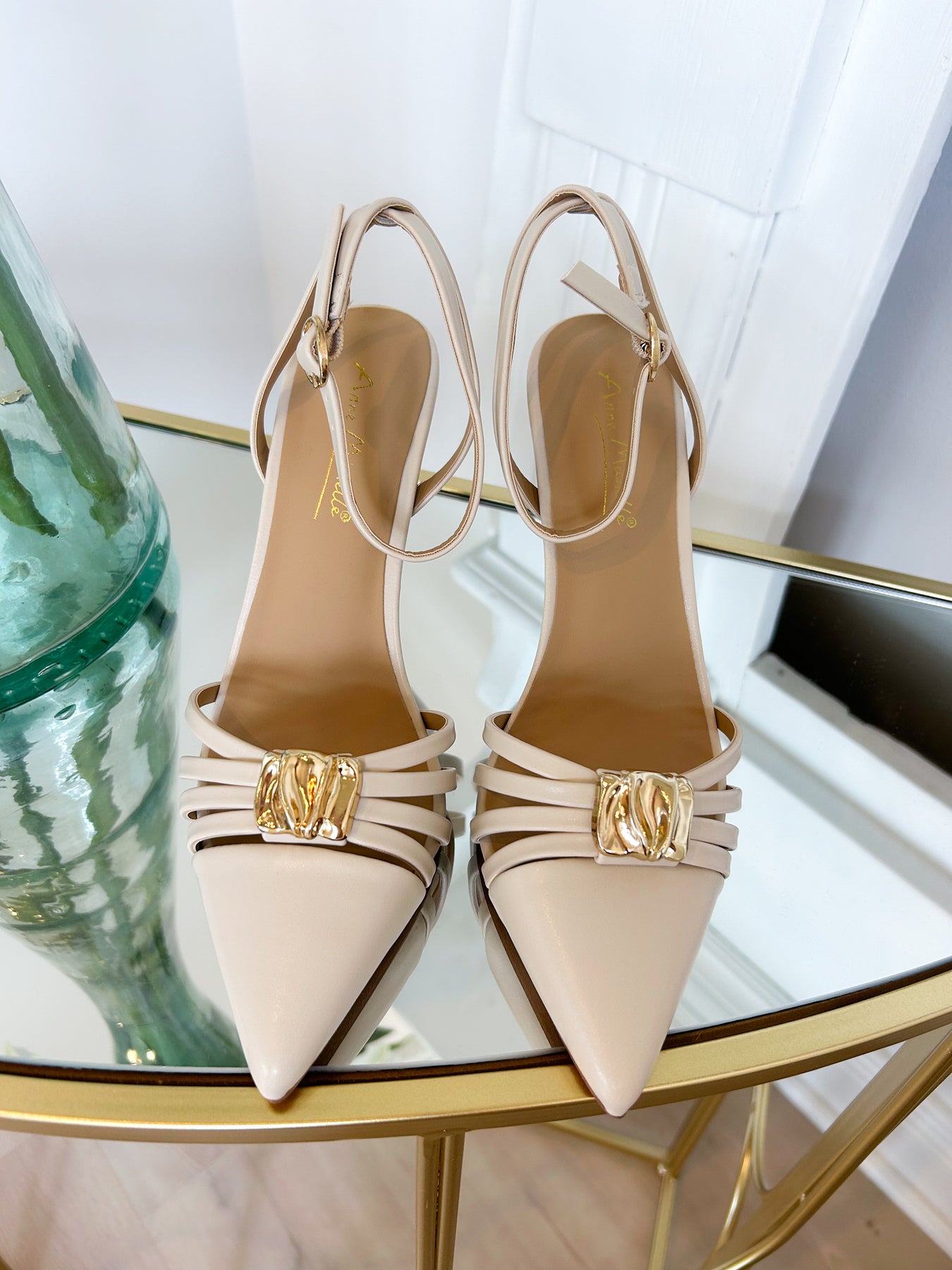 Strappy pump with gorgeous gold accent piece and ankle strap!