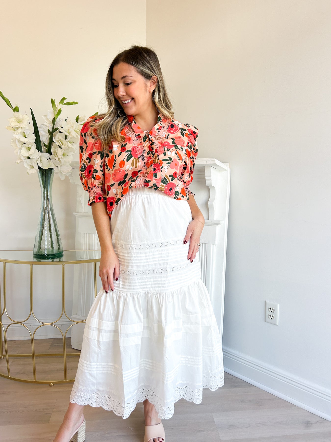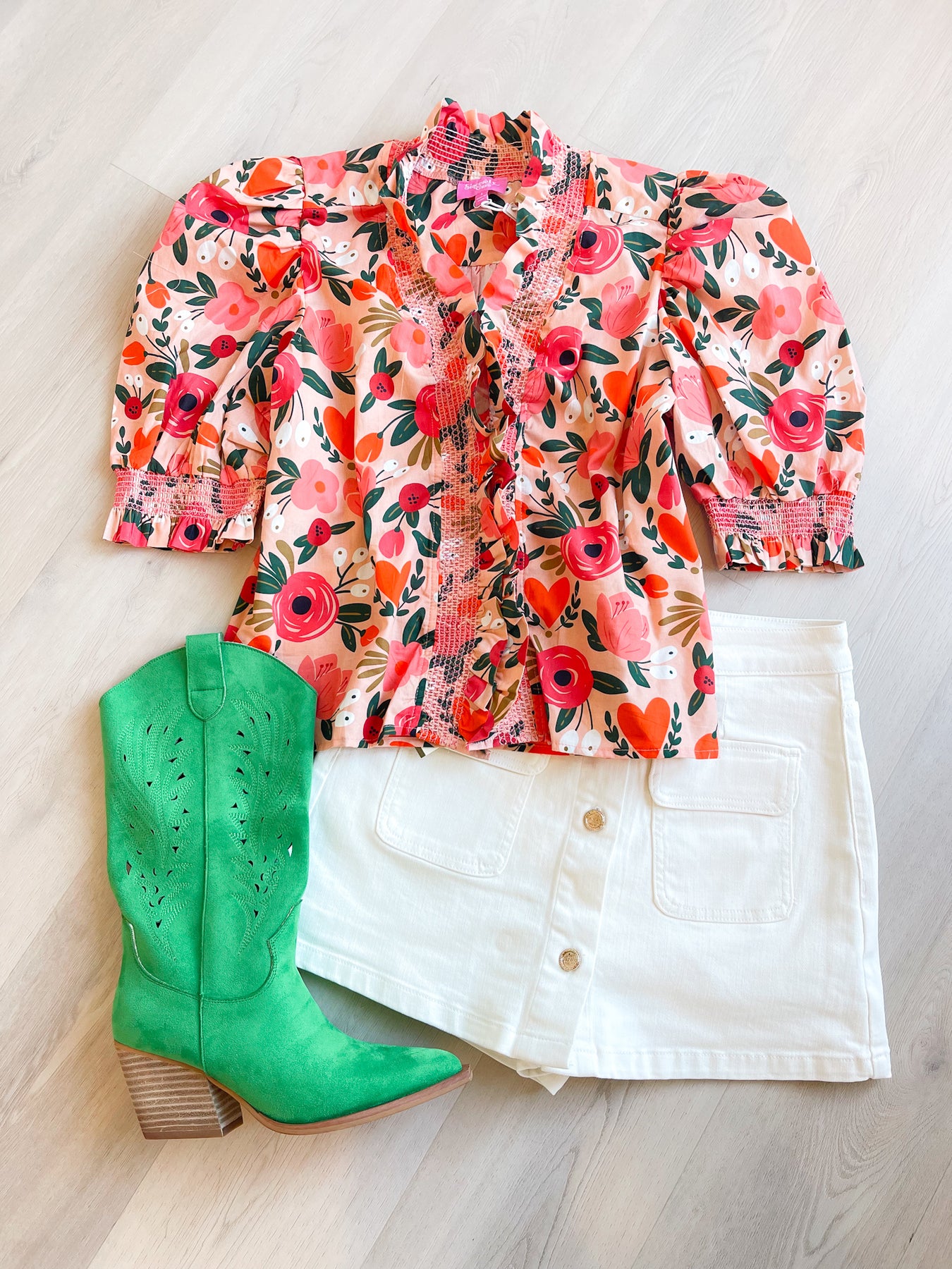 Bold florals meet an effortless, flattering fit in the Arabella Top. Designed with soft puff sleeves and delicate detailing, this top brings the perfect pop of color to your spring wardrobe. Lightweight and easy to wear, it pairs beautifully with skirts, denim, or tailored bottoms for a look that feels fresh and polished. Whether you’re heading to brunch, a spring gathering, or a casual day out, the Arabella Top adds just the right amount of charm.