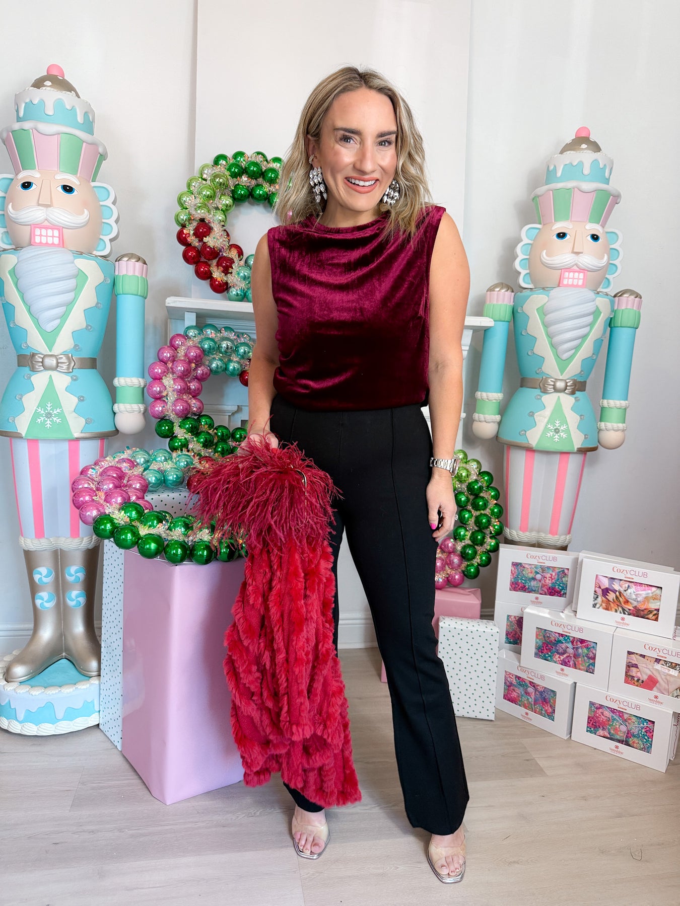 The Shaunee Top brings a touch of timeless sophistication with its soft velvet fabric and elegant draped neckline. This sleeveless silhouette is perfect for layering under blazers or pairing with festive skirts for a chic holiday look. Effortlessly polished with a subtle sheen, it’s the perfect piece to elevate your evening wardrobe all season long.