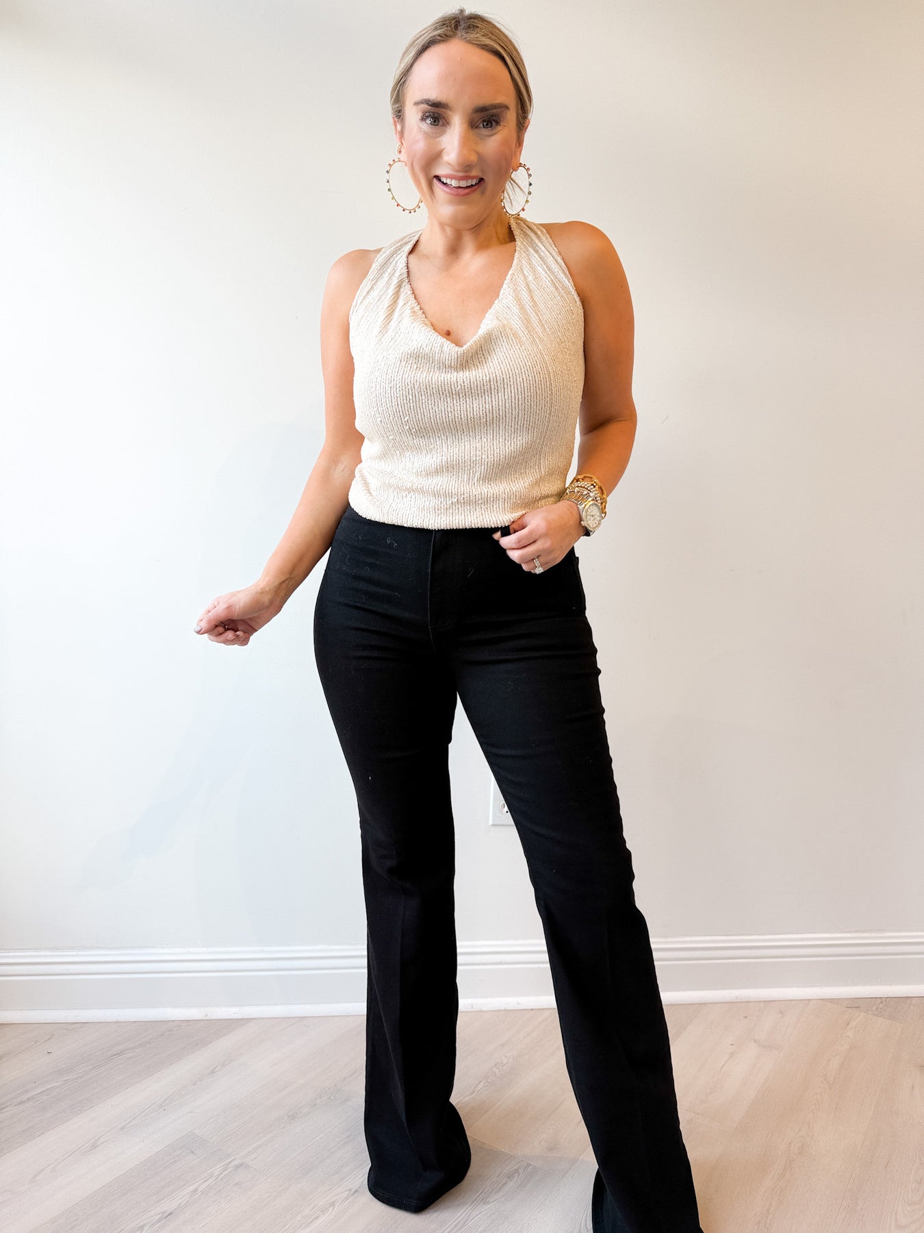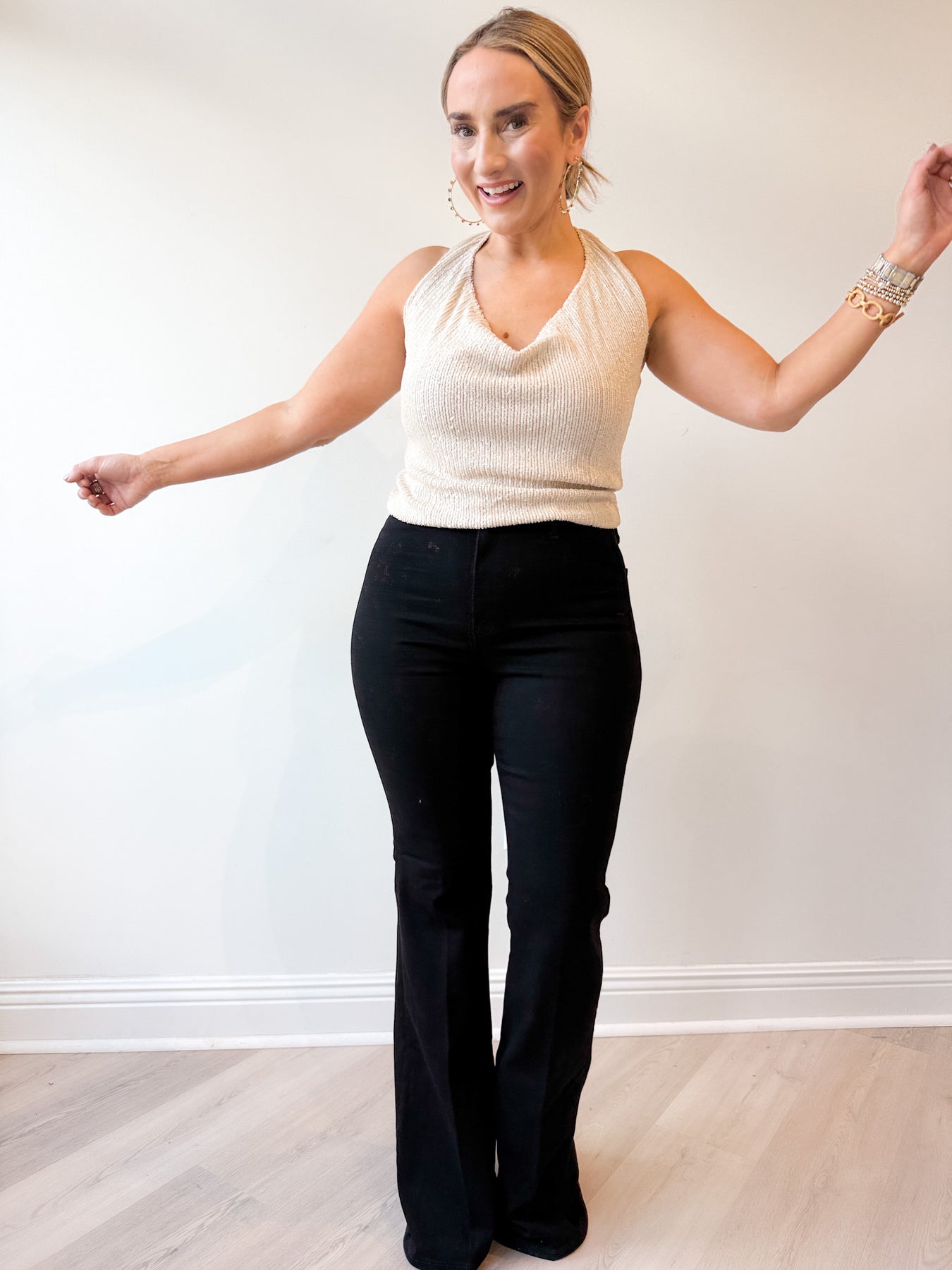 The Maple Top is your go-to piece for effortless elegance. Designed with a soft shimmer knit and flattering halter neckline, it drapes beautifully to highlight the shoulders and collarbone. Perfect for a night out or a dressed-up daytime look, this top pairs flawlessly with high-waisted denim, skirts, or tailored pants for a chic yet easy ensemble.