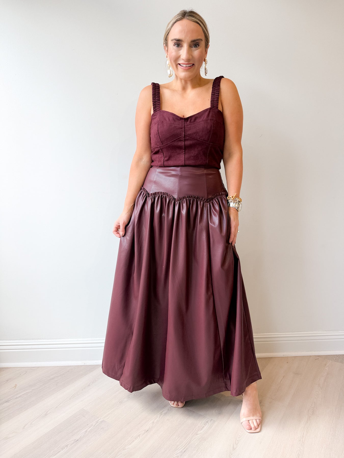 The Lennox Top is a structured statement piece that blends timeless tailoring with modern femininity. Featuring wide gathered straps, defined seaming, and a fitted bodice, it creates a flattering silhouette that pairs perfectly with skirts, trousers, or denim. The rich wine hue and luxe texture make it a standout for holiday events, date nights, or any occasion where you want to feel confident and chic.