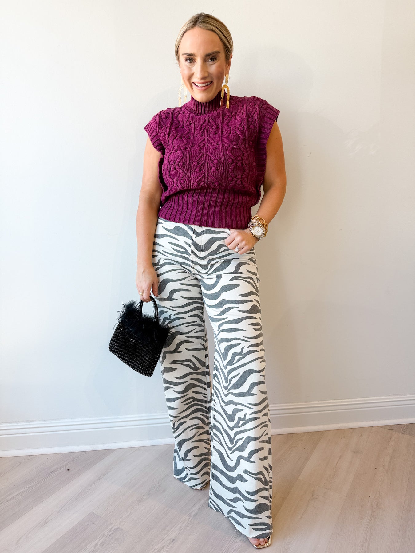 The Cosmia Vest brings a fresh pop of color and cozy texture to your fall wardrobe. This rich plum cable-knit sweater vest features a mock neckline, capped sleeves, and a flattering ribbed hem for a structured yet comfortable fit. Perfect for layering over blouses or pairing with bold statement pants — it’s chic, versatile, and effortlessly on trend.