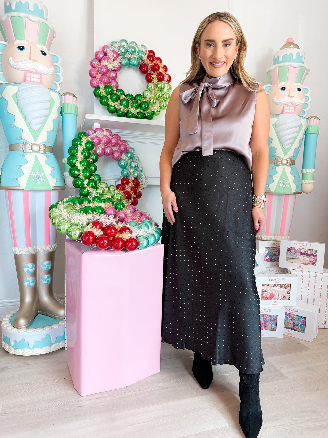 Classic with a hint of sparkle — the Jeannie Skirt elevates your everyday style with its sleek satin finish and subtle studded detailing. The flowy A-line silhouette offers effortless movement, while the flattering high waist makes it easy to pair with fitted tops, cozy knits, or chic blouses. Perfect for the office, holiday events, or a polished night-out look.