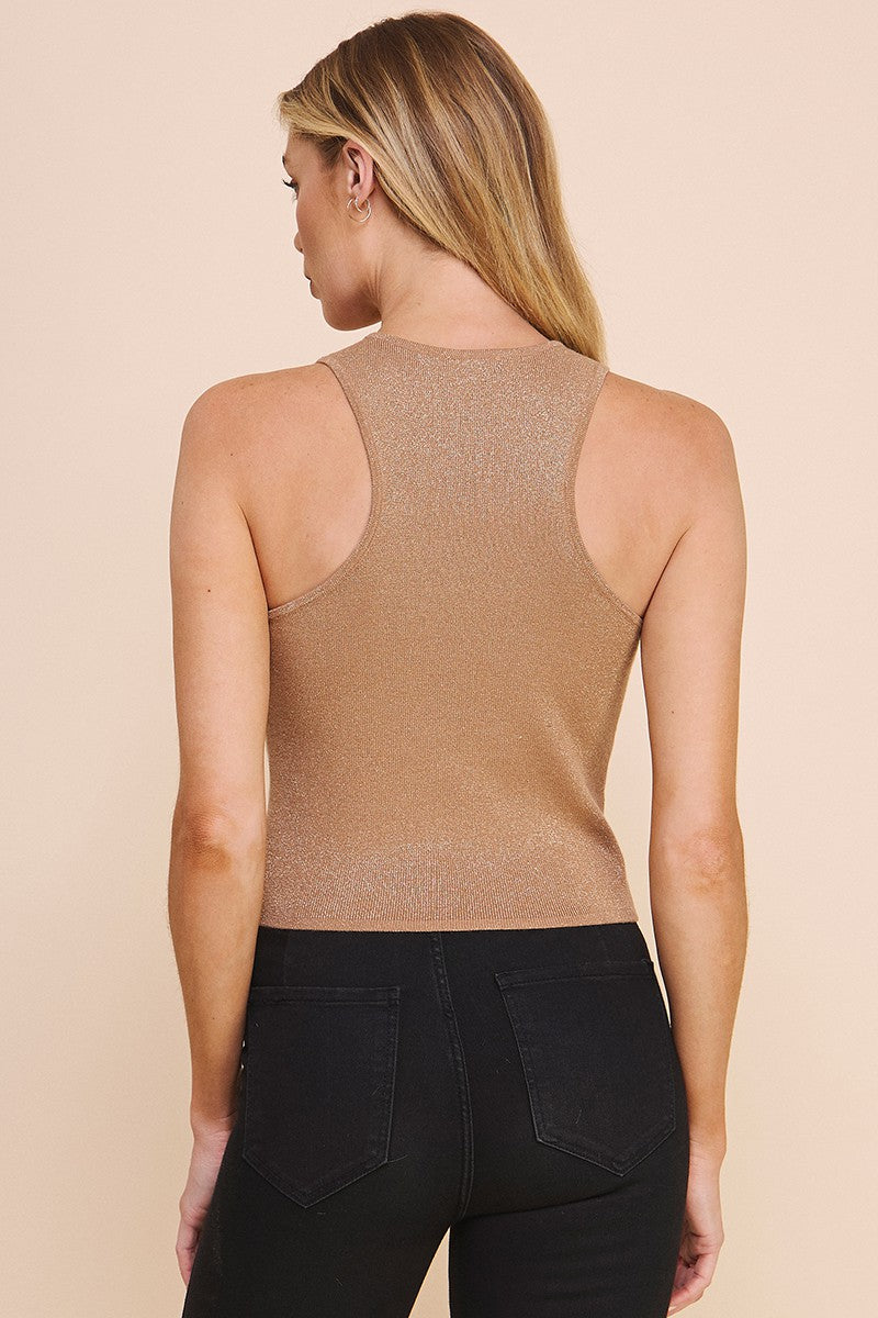 Sleek with a subtle shimmer, the Ellie Gauge Racer Tank is the perfect elevated basic for layering or wearing on its own. Crafted from a fine gauge knit, this tank features a flattering racer silhouette and a soft, lightweight feel that hugs just right. Dress it up with tailored pants or keep it casual with denim for an effortless day-to-night look.