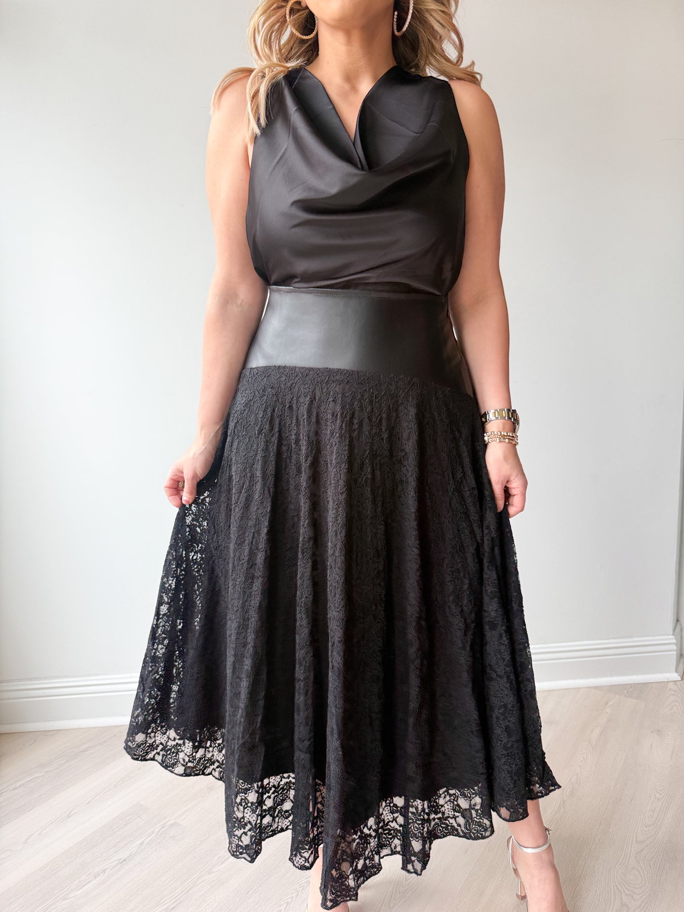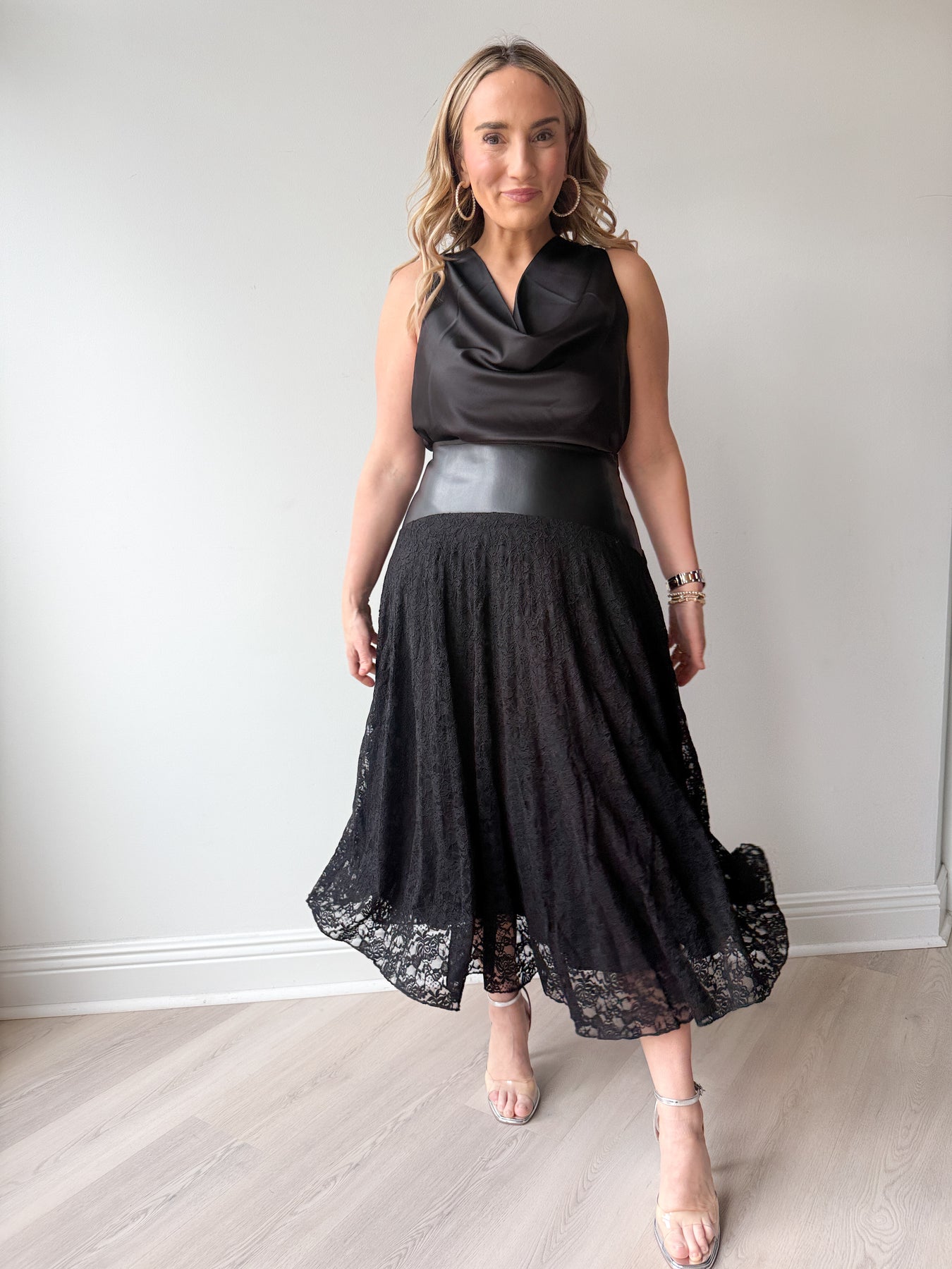 The Camille Lace Midi Skirt is elegance redefined—crafted with delicate lace and a sleek waistline for a modern edge. Its flowing silhouette makes it the perfect piece to dress up or style effortlessly for an evening out.