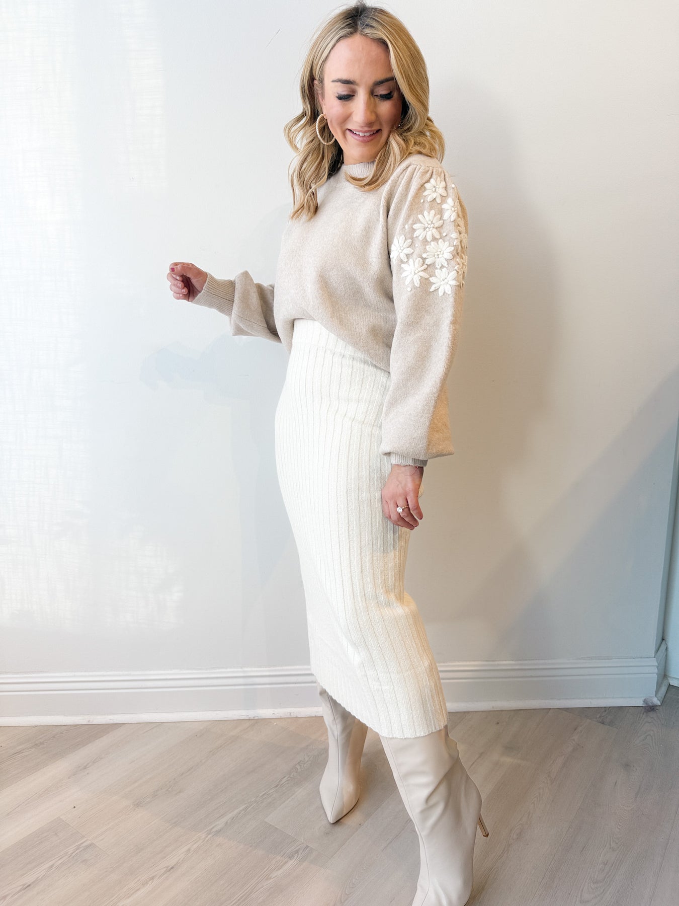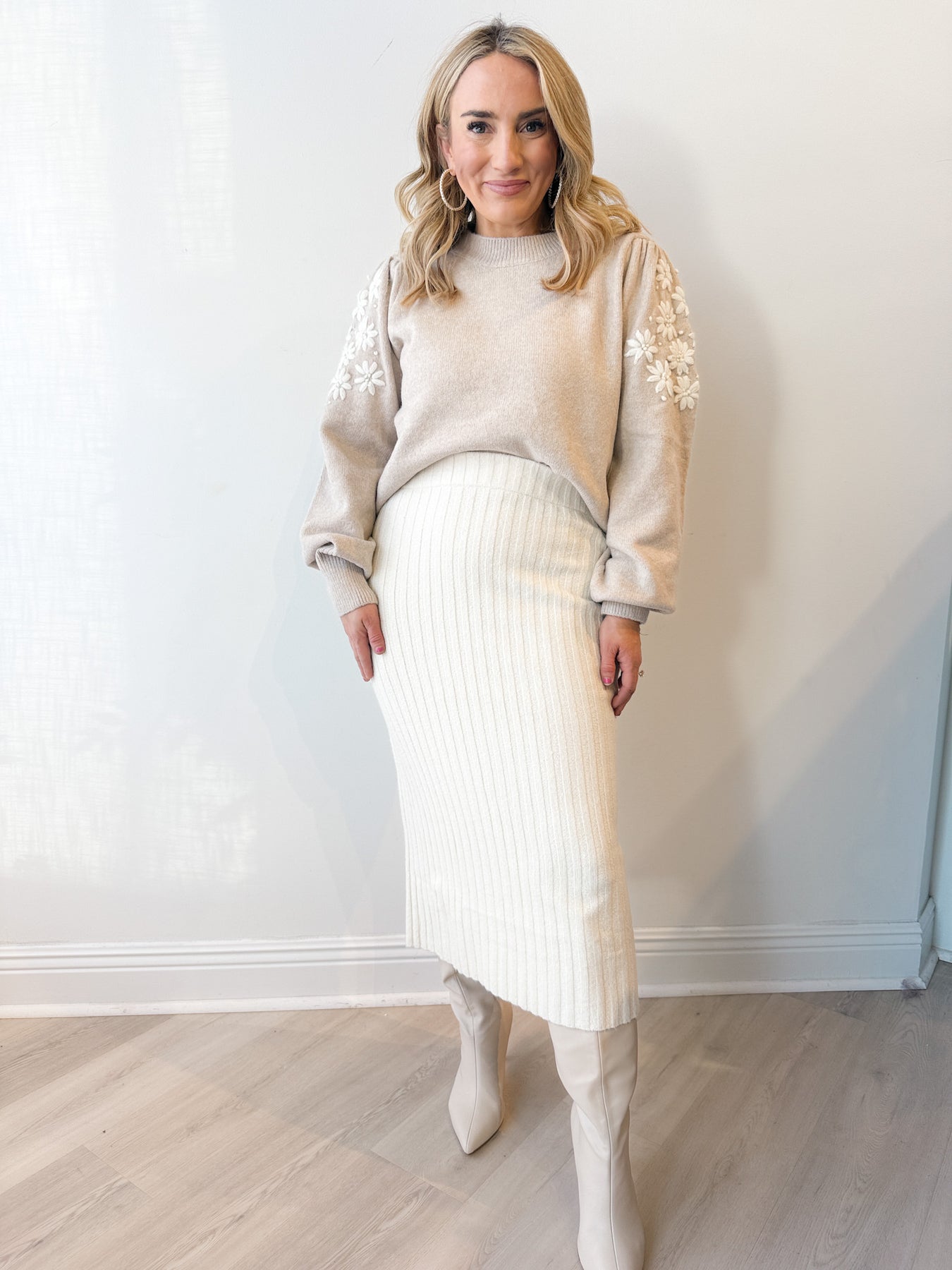 Soft and feminine with a cozy twist—this knit sweater features delicate floral embroidery along the sleeves for a subtle pop of charm. Pair it with denim, skirts, or layered under a jacket for a timeless look that feels fresh and polished.