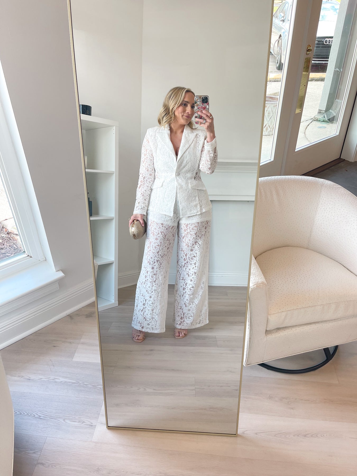 Elevated and effortlessly feminine, the Rachel Lace Blazer brings a romantic twist to a classic tailored silhouette. Crafted from intricate lace fabric, this statement piece features structured lapels and a polished single-button closure that creates a flattering, tailored fit. The semi-sheer lace sleeves add delicate texture while keeping the look light and elegant.