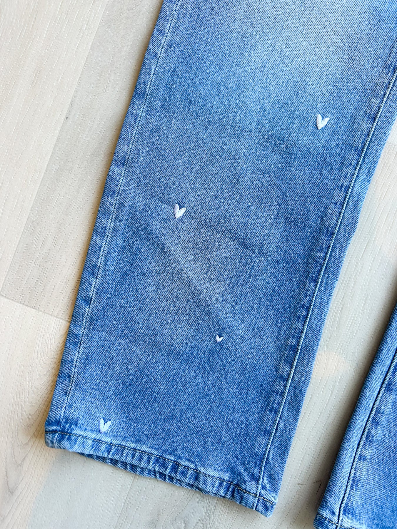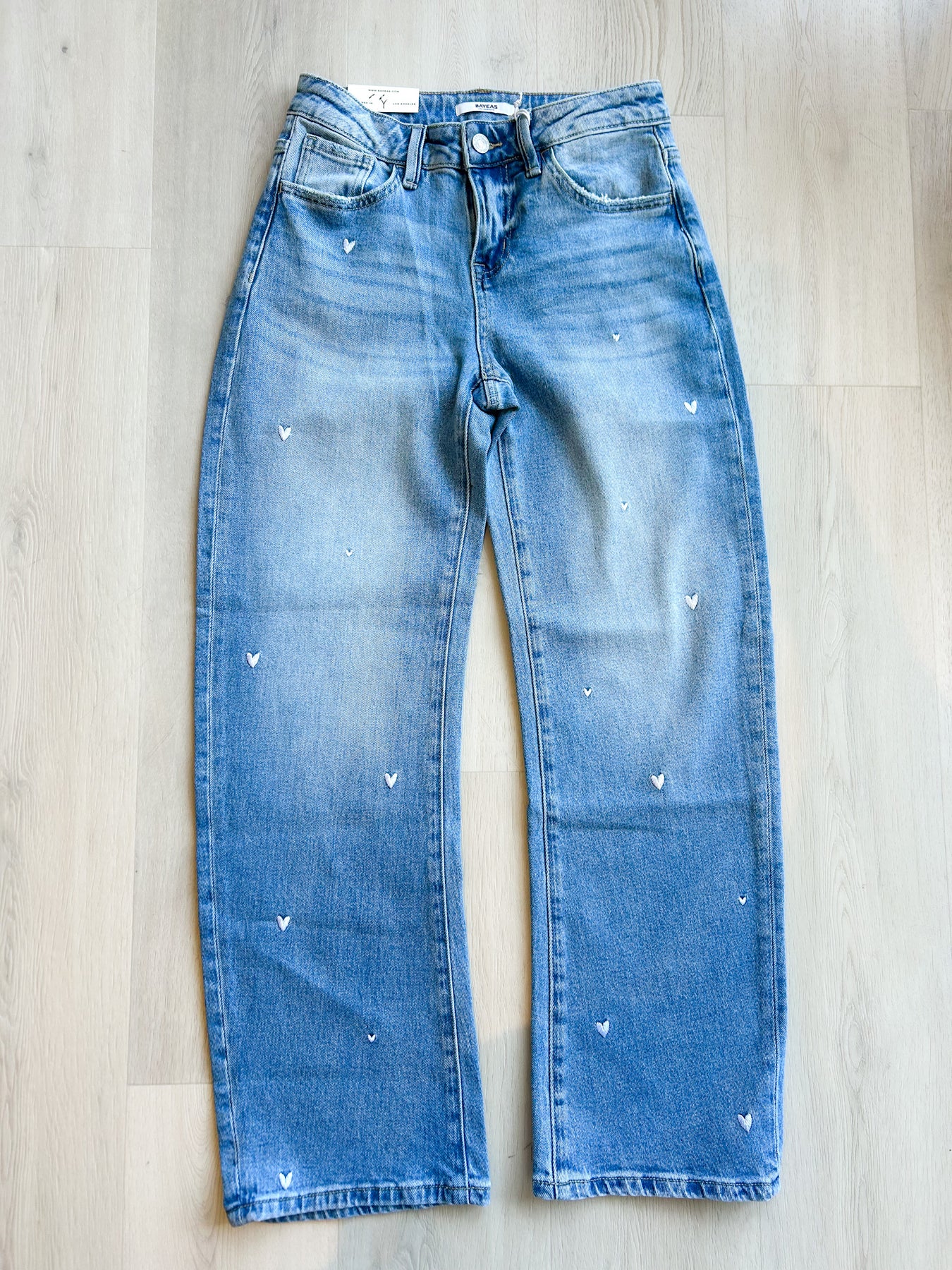 Loving these new jeans! Mid rise barrel pants in a classic five pocket design, featuring heart-shaped embroidery details on both front and back panels.