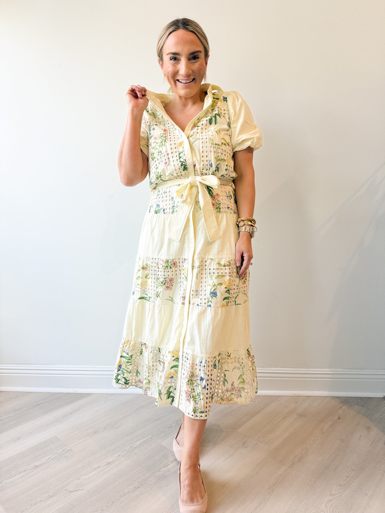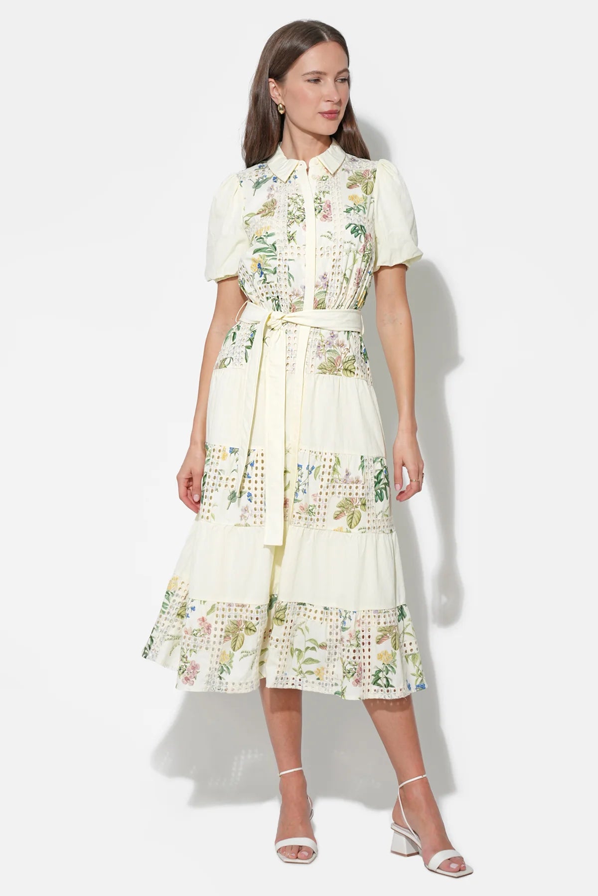 The defining characteristic is the combination of embroidery and eyelet fabric, which creates a delicate, intricate texture and pattern throughout. The silhouette is a graceful tiered midi dress, which means the skirt flows beautifully in soft layers, adding movement and volume to the elegant mid-calf length.