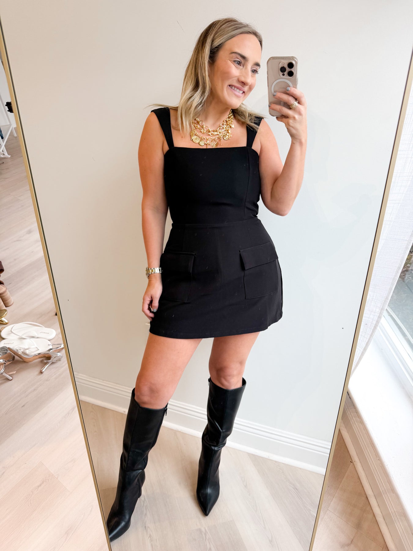 The Amanda Dress is the ultimate little black dress with a modern twist. Designed with a sleek square neckline, wide straps, and a tailored mini silhouette, it’s chic and versatile for any occasion. Functional front pockets add just the right amount of detail, while the built-in shorts underneath provide comfort, coverage, and confidence no matter where the night takes you. Pair it with boots or heels for an effortlessly elevated look.