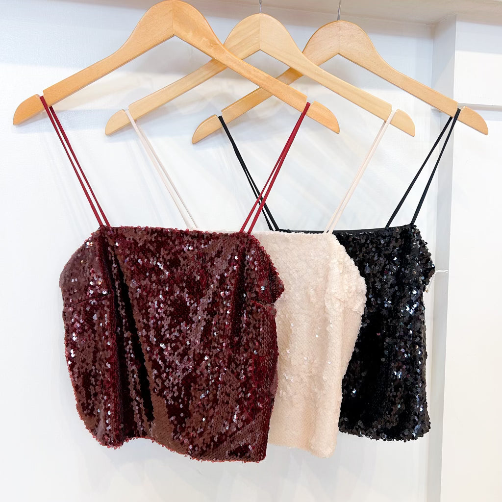 Turn heads in the Sublime Cami – a sparkling strapless sequin top that’s equal parts glam and versatile. Pair it with sleek trousers or a playful skirt for a look that shines from dinner to dance floor.