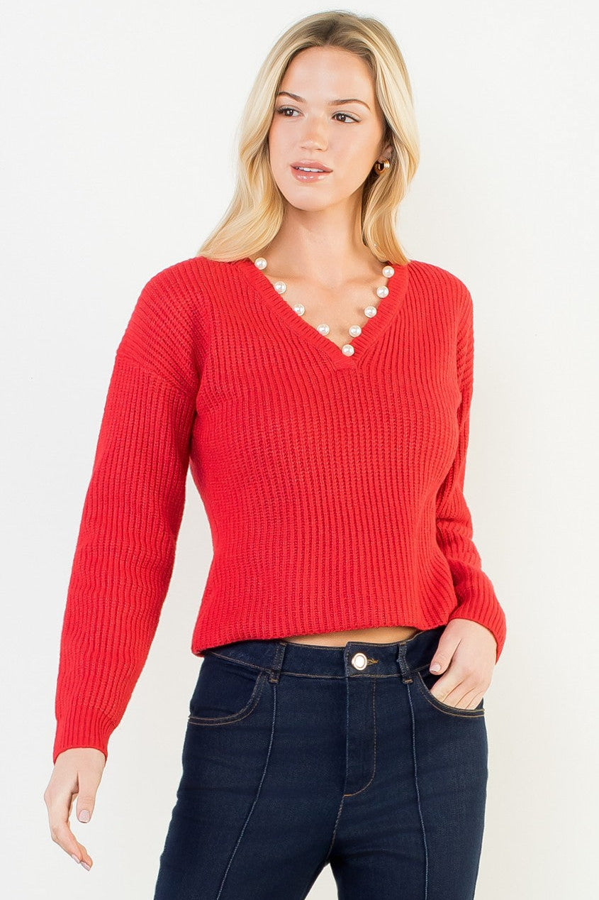 The Cindy Pearl V-Neck Knitted Top is a timeless knit with an elevated twist. Designed with a flattering V-neckline adorned with delicate pearl accents, this piece adds just the right amount of elegance to an everyday staple. The ribbed knit texture creates a soft, comfortable fit while maintaining a polished, put-together look.