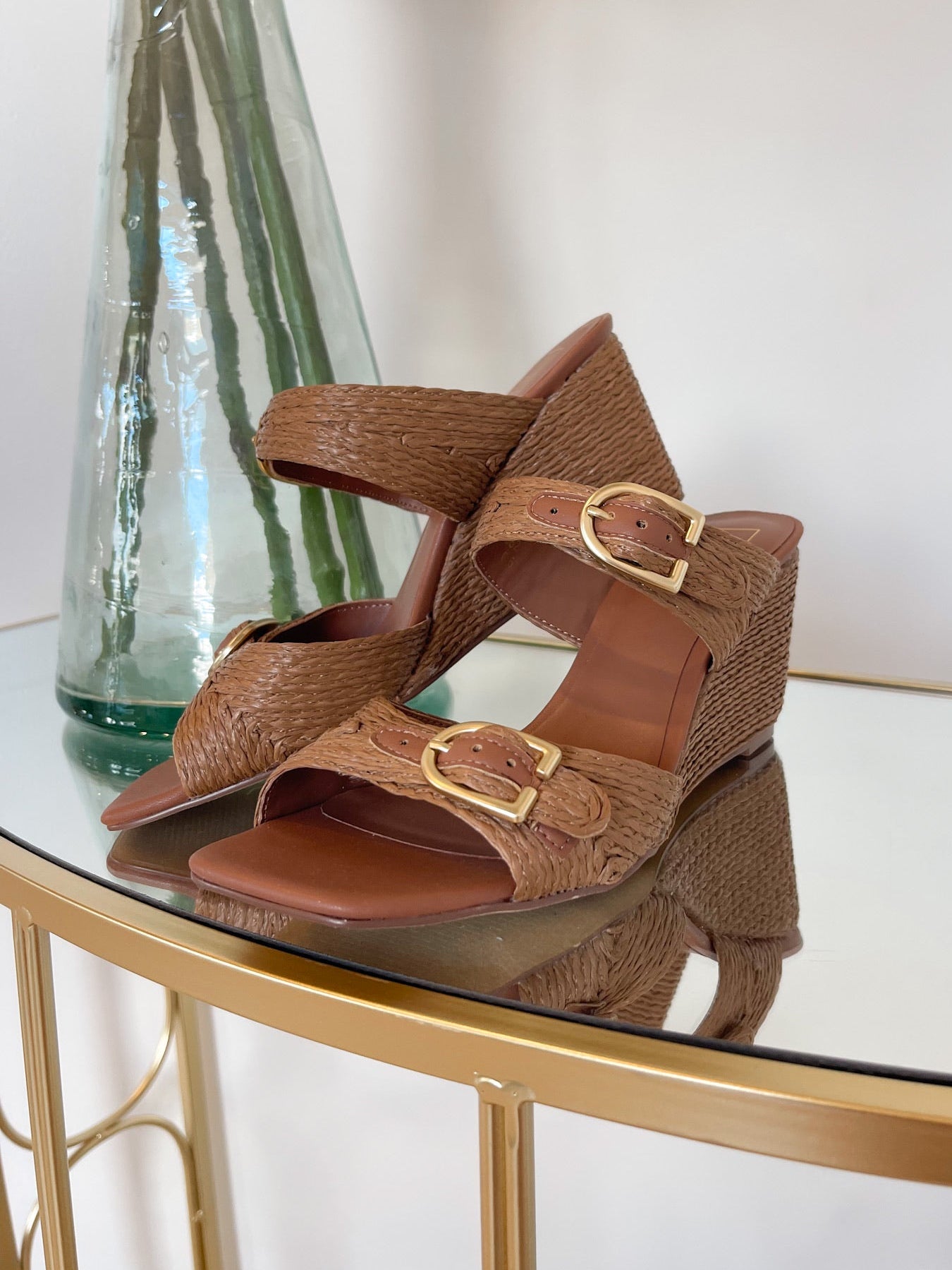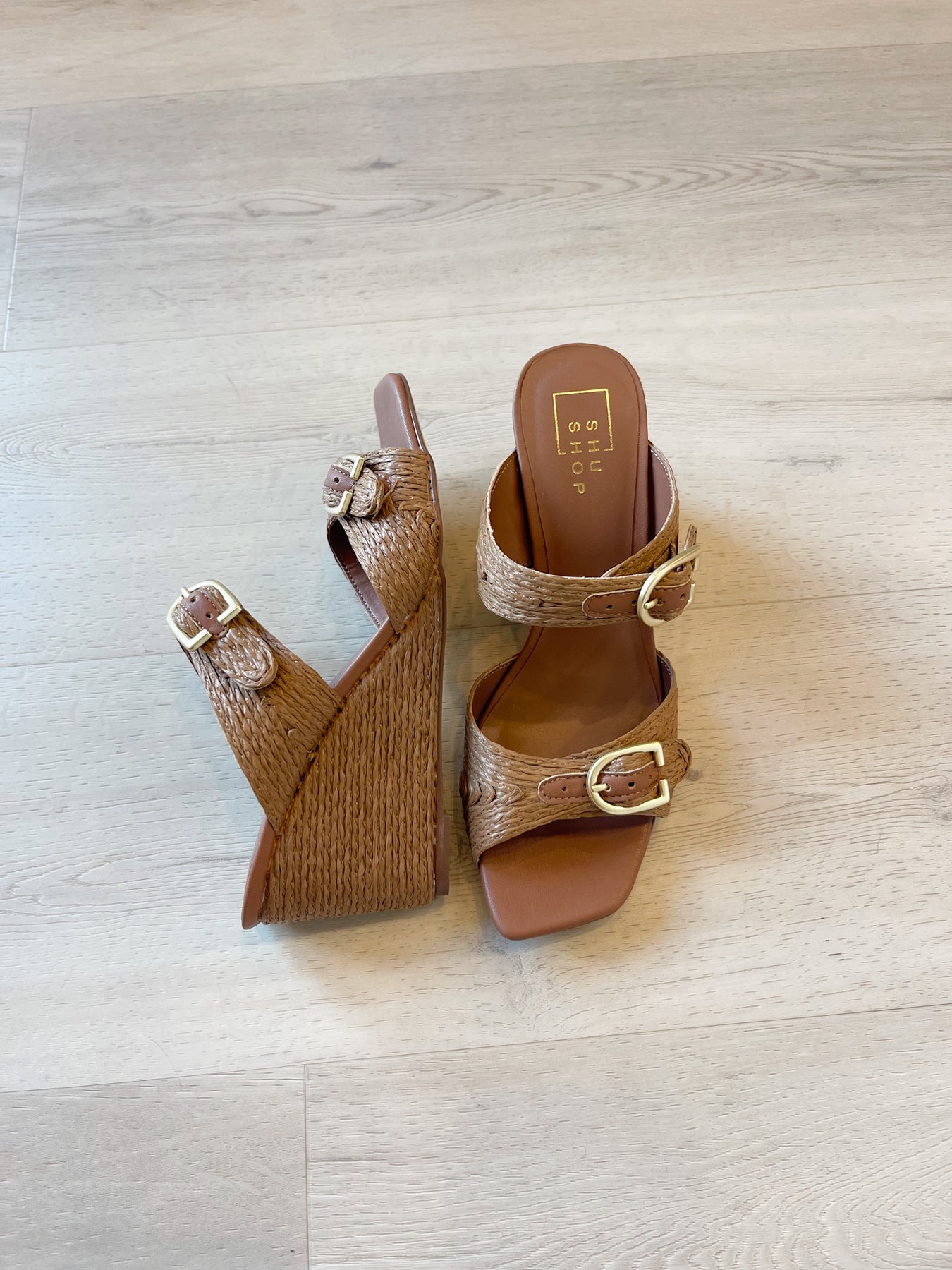 These wedges feature a warm tan woven texture that gives them a natural, raffia-inspired look. The design includes two wide straps across the foot, each accented with a bold gold buckle for a polished touch. The square toe adds a modern edge, while the matching woven wedge heel offers height with stability and comfort. Finished with a smooth cognac-toned footbed, they’re the perfect blend of earthy texture and elevated style — ideal for spring and summer outfits.