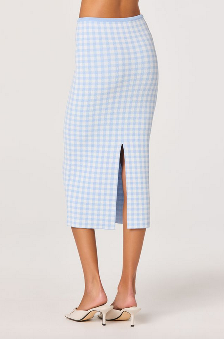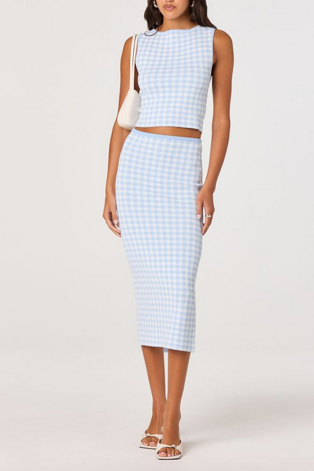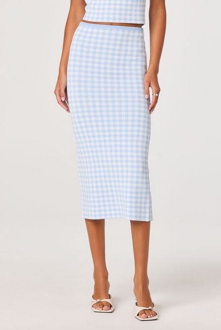 The Babbett Sweater Skirt is the perfect match to the Babbett Top, giving you that effortlessly polished, coordinated look. Crafted from a soft, lightweight knit, this midi skirt features a flattering high-rise fit and a sleek, body-skimming silhouette. The subtle gingham pattern adds a fresh, feminine touch, while the streamlined design keeps it elevated and versatile.