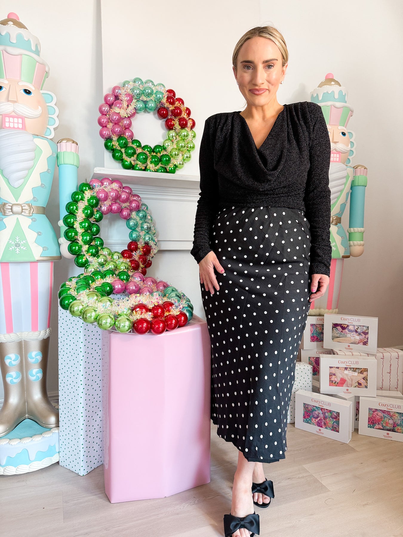 Pair it with the matching Britt Polka Dot Top for a standout set, or mix it with a cozy sweater or sleek bodysuit for a look that goes from festive gatherings to date nights with ease. A timeless print that never goes out of style!