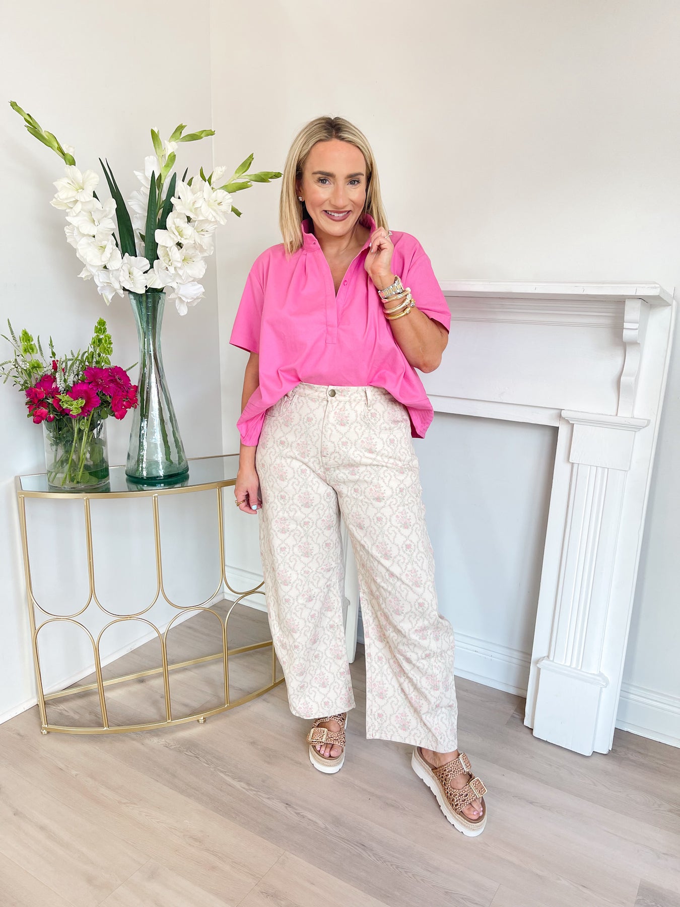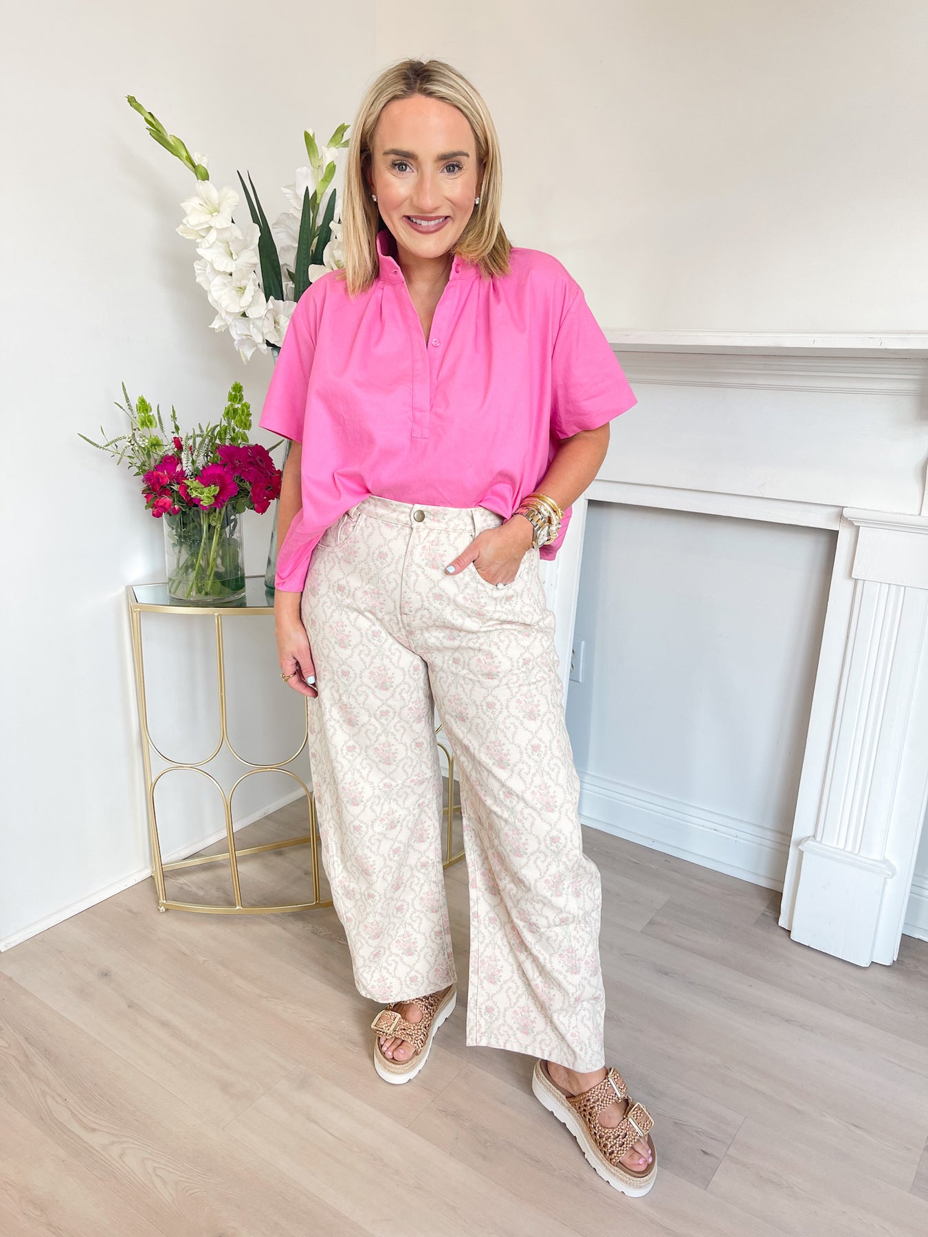 A relaxed short-sleeve top featuring a modern stand collar and partial button-front neckline for a polished yet casual look. Designed with an easy, slightly oversized fit and lightweight fabric, it drapes comfortably for effortless everyday styling.