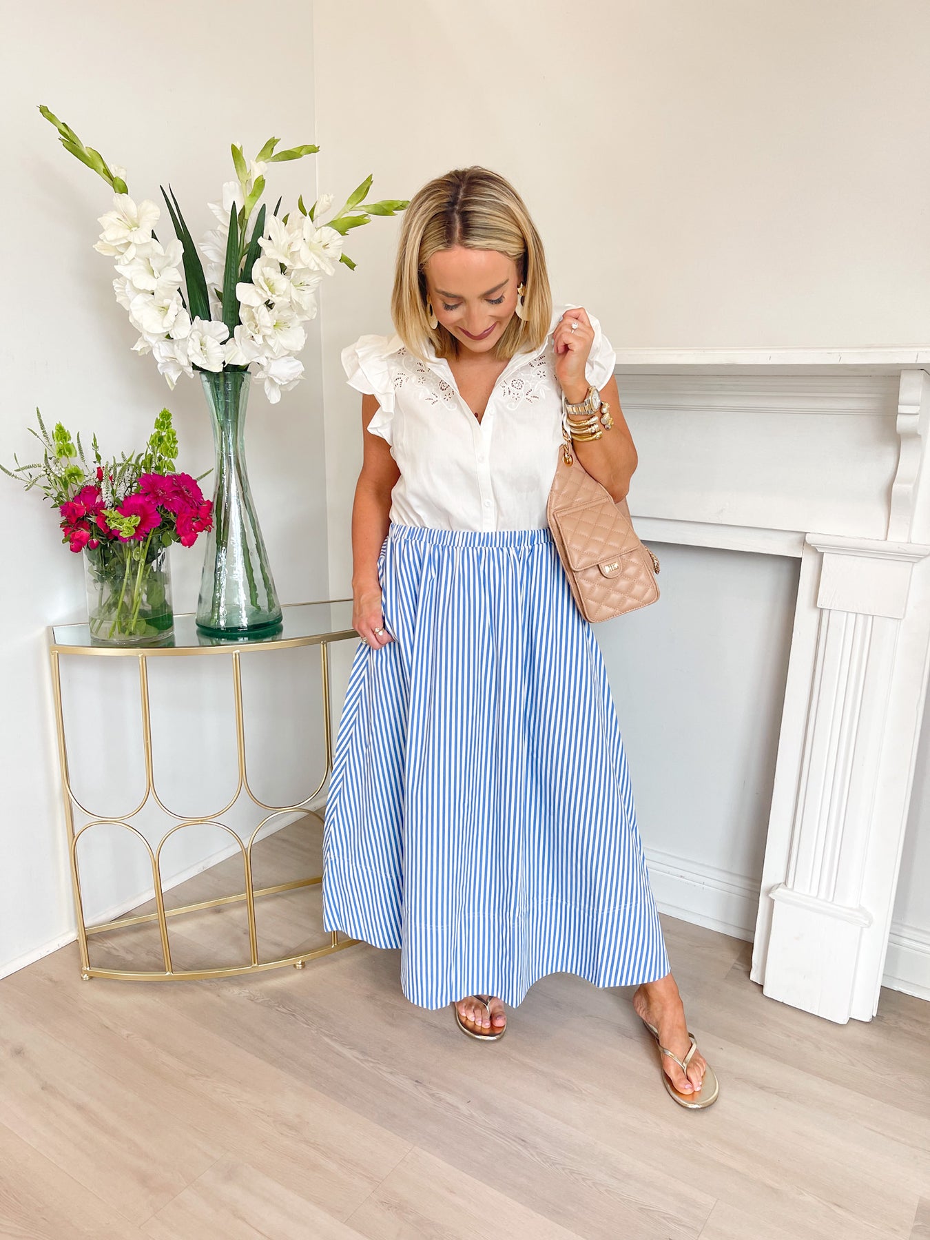 A feminine sleeveless blouse featuring delicate eyelet embroidery across the front for a soft, detailed touch. Designed with a classic collar, button-front closure, and layered ruffle sleeves that add a playful, romantic feel. Lightweight and airy, it’s perfect for warm-weather styling.