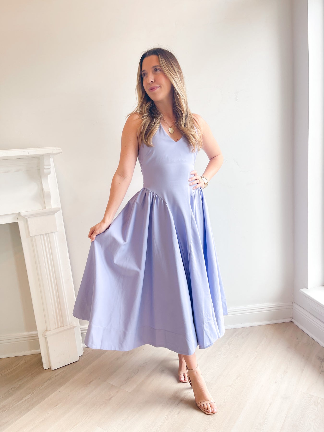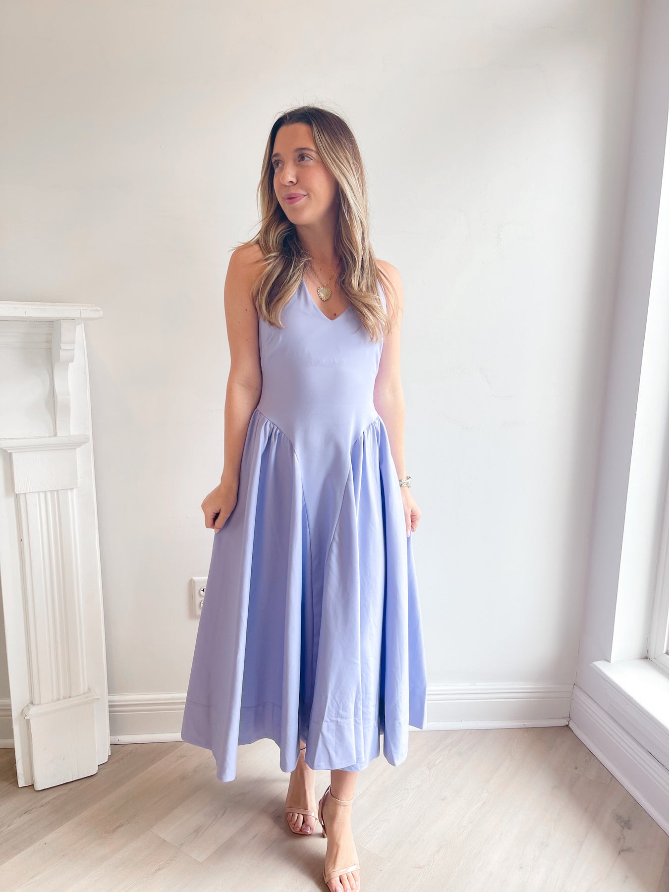 The Meana Dress is designed with timeless simplicity and graceful movement in mind. Featuring a flattering V-neckline and a beautifully structured bodice, this dress flows into a full, airy skirt that moves effortlessly with every step. The sleeveless silhouette keeps it light and comfortable, while the midi length adds an elegant touch that works for both casual and dressed-up occasions. Crafted from a lightweight fabric that drapes beautifully, the Meana Dress is perfect for weddings, showers, brunch dates, or warm-weather events—an easy, feminine piece you’ll love reaching for again and again.
