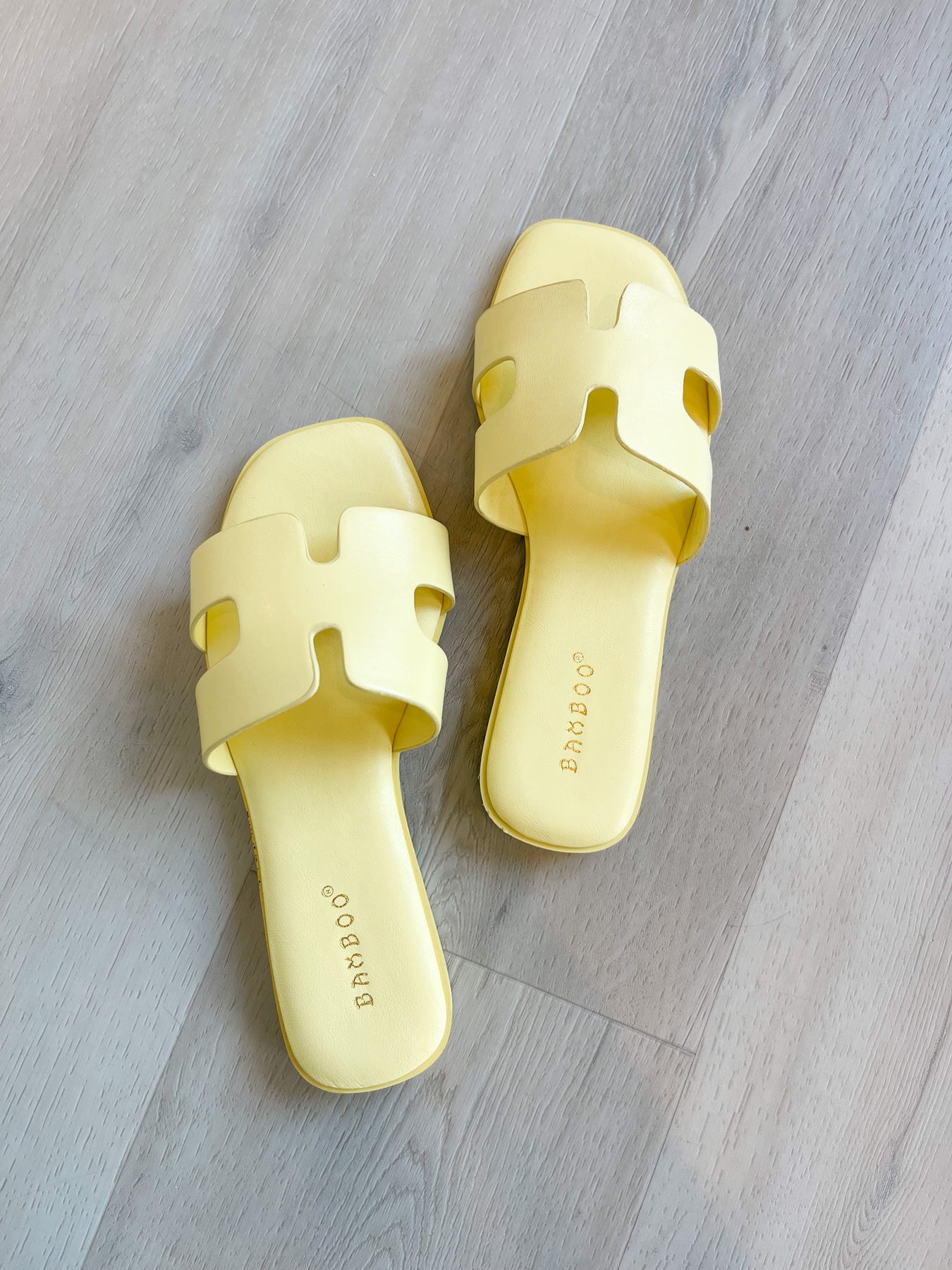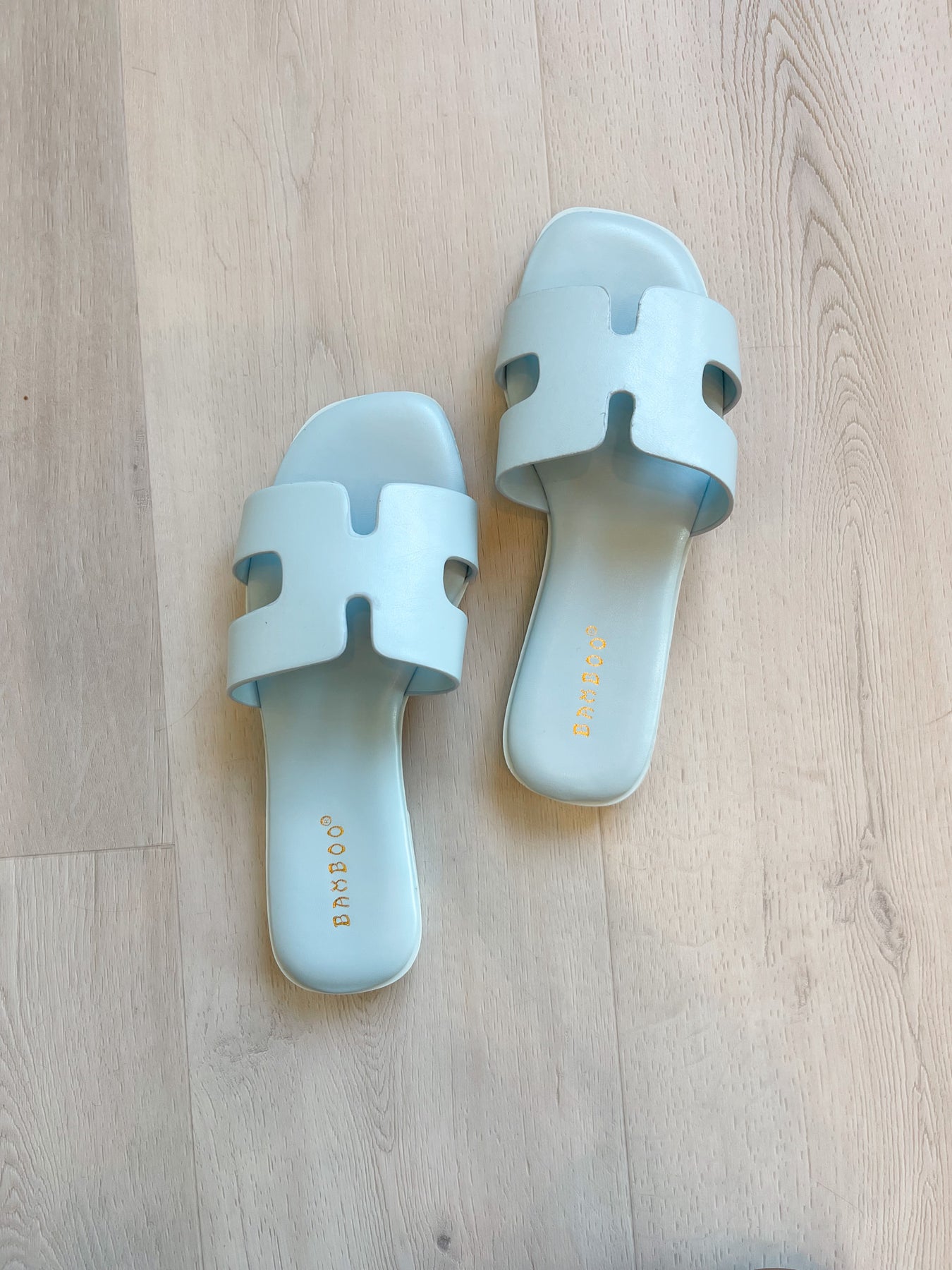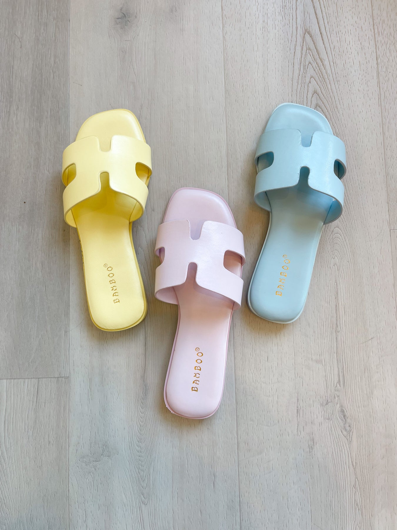 The Hampton Sandal is a chic slide featuring a bold cutout strap that gives them a modern, designer inspired feel. They are designed with a flat sole and soft cushioned foot bed, offering easy slip-on style that is both comfortable and effortlessly stylish. The smooth matte finish adds a polished look while the pastel color options make them perfect for spring and summer styling.