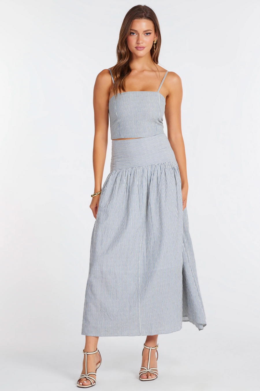 Meet the Sorrento Maxi Skirt, a flowing ivory silhouette adorned with subtle stripes detailing and a softly gathered waist that moves with effortless grace. Style with the coordinating top or wear with a slim knit tank and leather sandals for relaxed, effortless look.