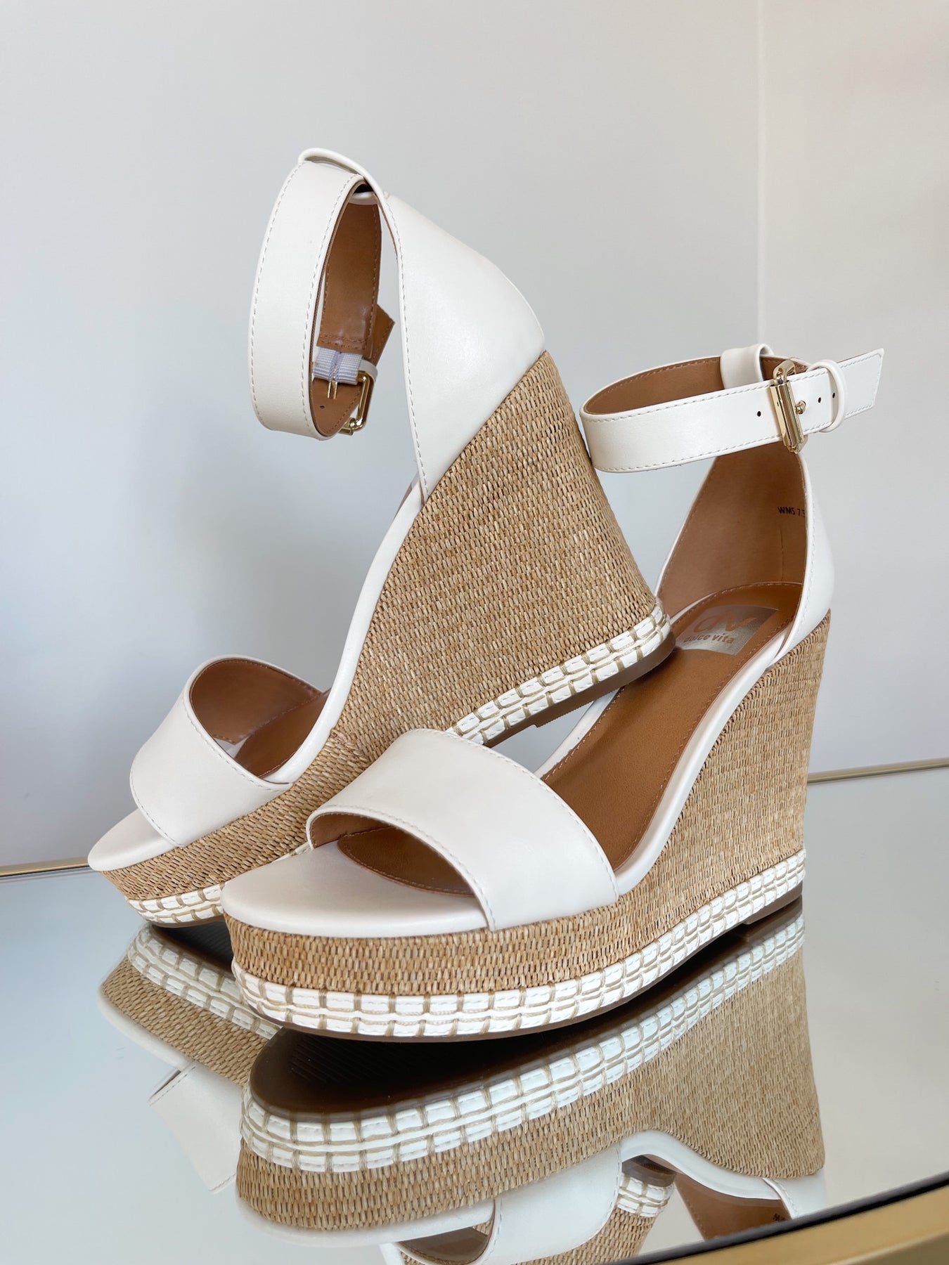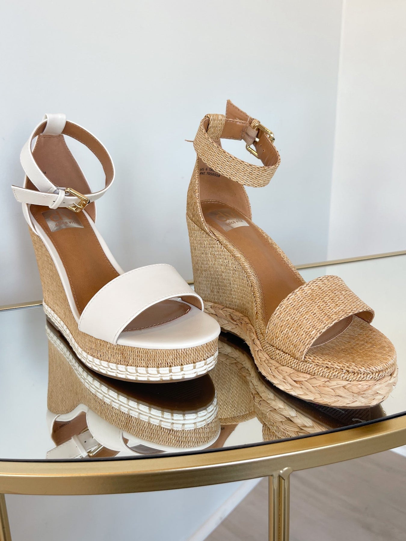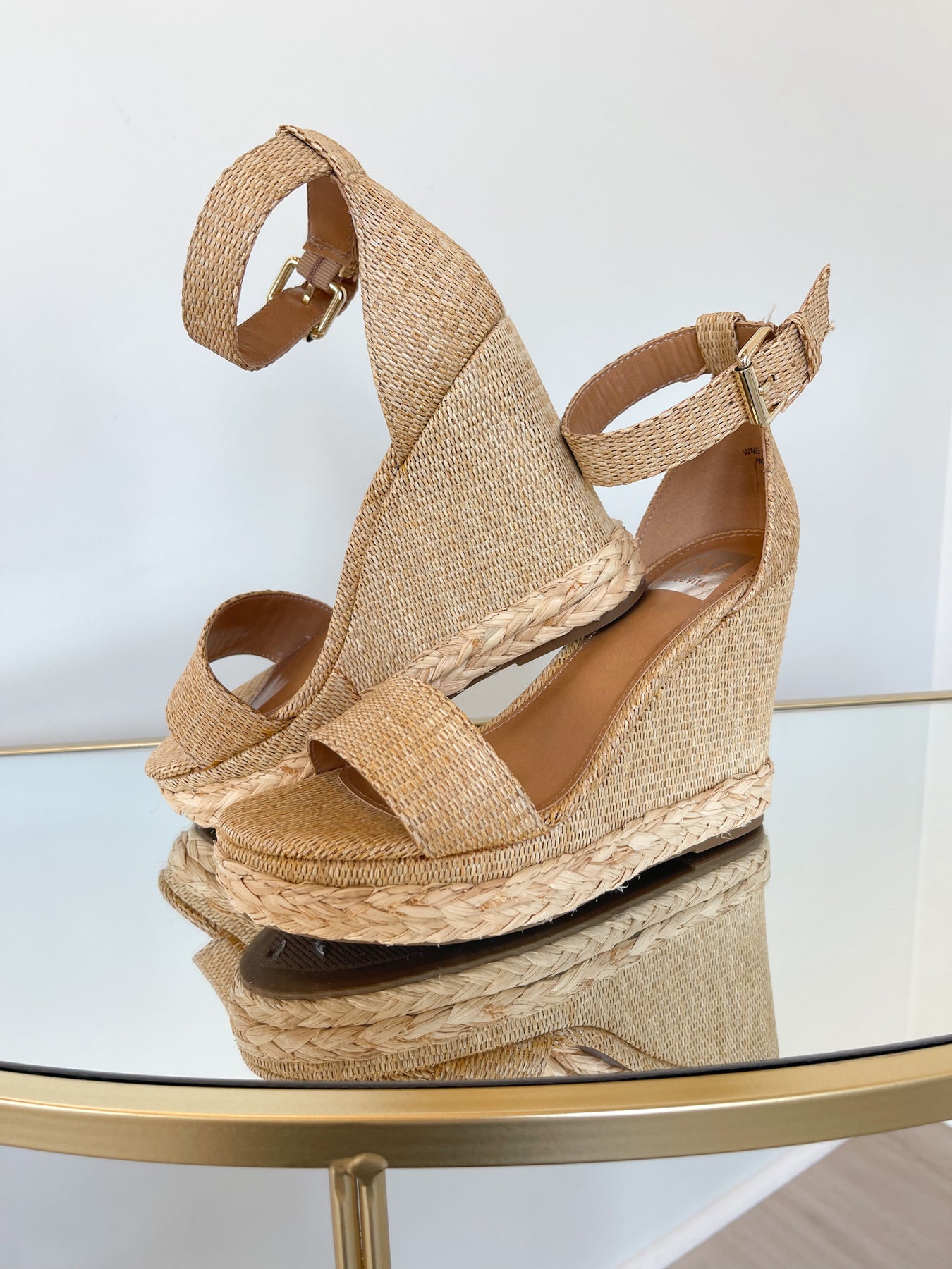 The Tammara Wedge blends effortless summer style with everyday comfort. Designed with a sturdy espadrille-inspired wedge heel, they feature a woven texture that adds a natural feel. The wide front strap offers a secure fit, while the adjustable ankle strap with gold hardware provides support and a polished finish. Available in both a smooth ivory and fully raffia-wrapped neutral option, these wedges are perfect for pairing with sundresses, denim, or breezy resort looks.
