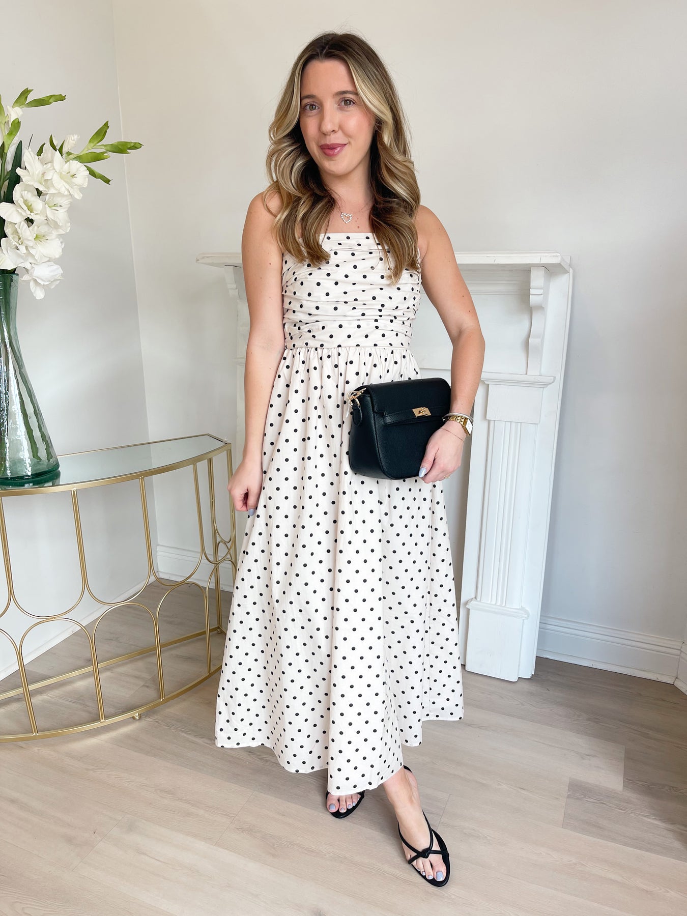 The classic cream base with black polka dots gives it that chic, Parisian-inspired feel — perfect for brunch dates, showers, vacation dinners, or summer events. The lightweight fabric keeps it breathable and comfortable while the structured bodice creates a flattering, feminine silhouette.