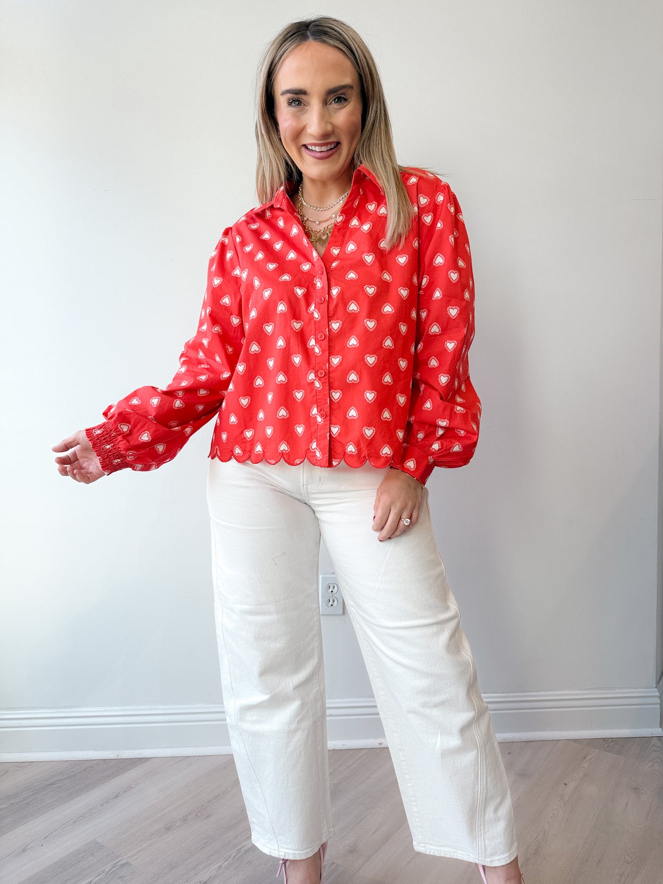 Designed with a classic collared neckline, full button front, and subtly puffed long sleeves with elasticized cuffs, this heart poplin blouse offers a flattering, feminine silhouette. The crisp poplin fabric provides structure while remaining comfortable for all-day wear, making it perfect for work, weekend outings, or special occasions.