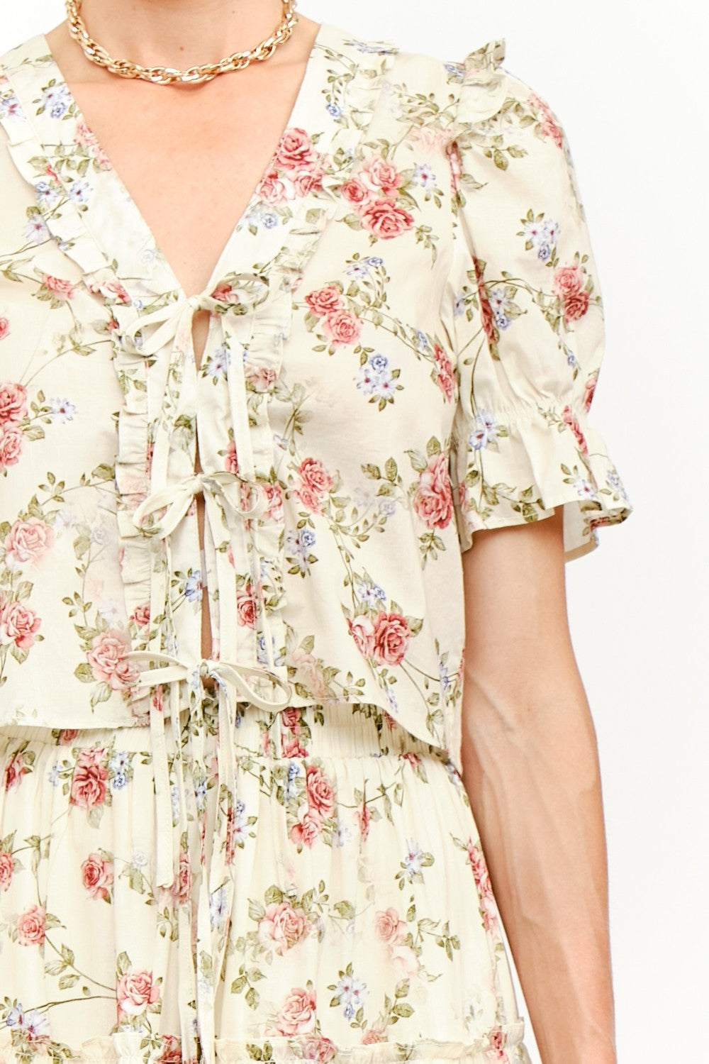 Romantic and effortlessly polished, the Brigitte Poplin Top is all about the details. Featuring a soft floral print, feminine ruffle trim, and adjustable front tie closures, this lightweight top brings a vintage-inspired charm with a modern fit. The flutter sleeves and flattering V-neckline make it an easy choice for both casual days and dressed-up moments.