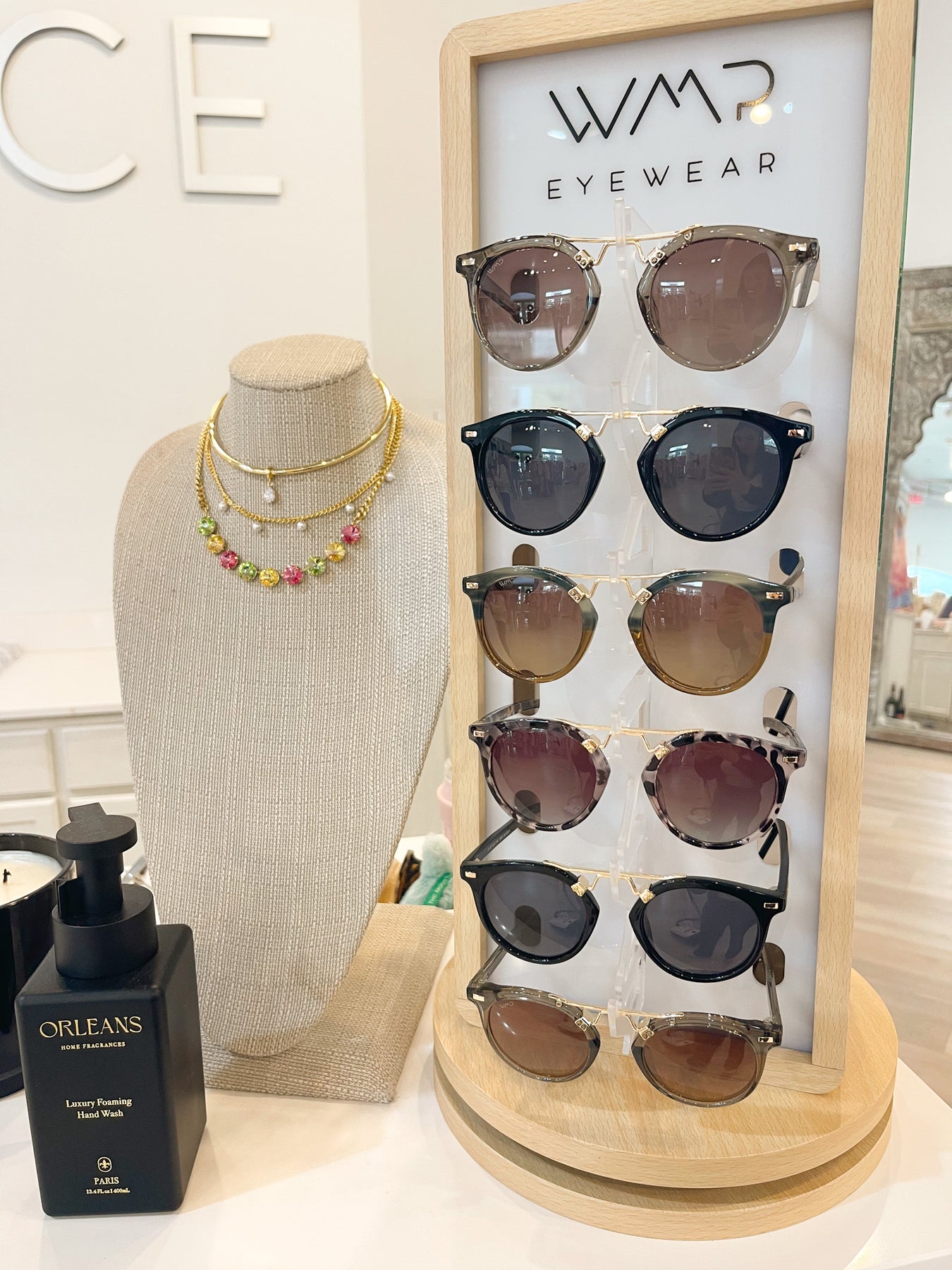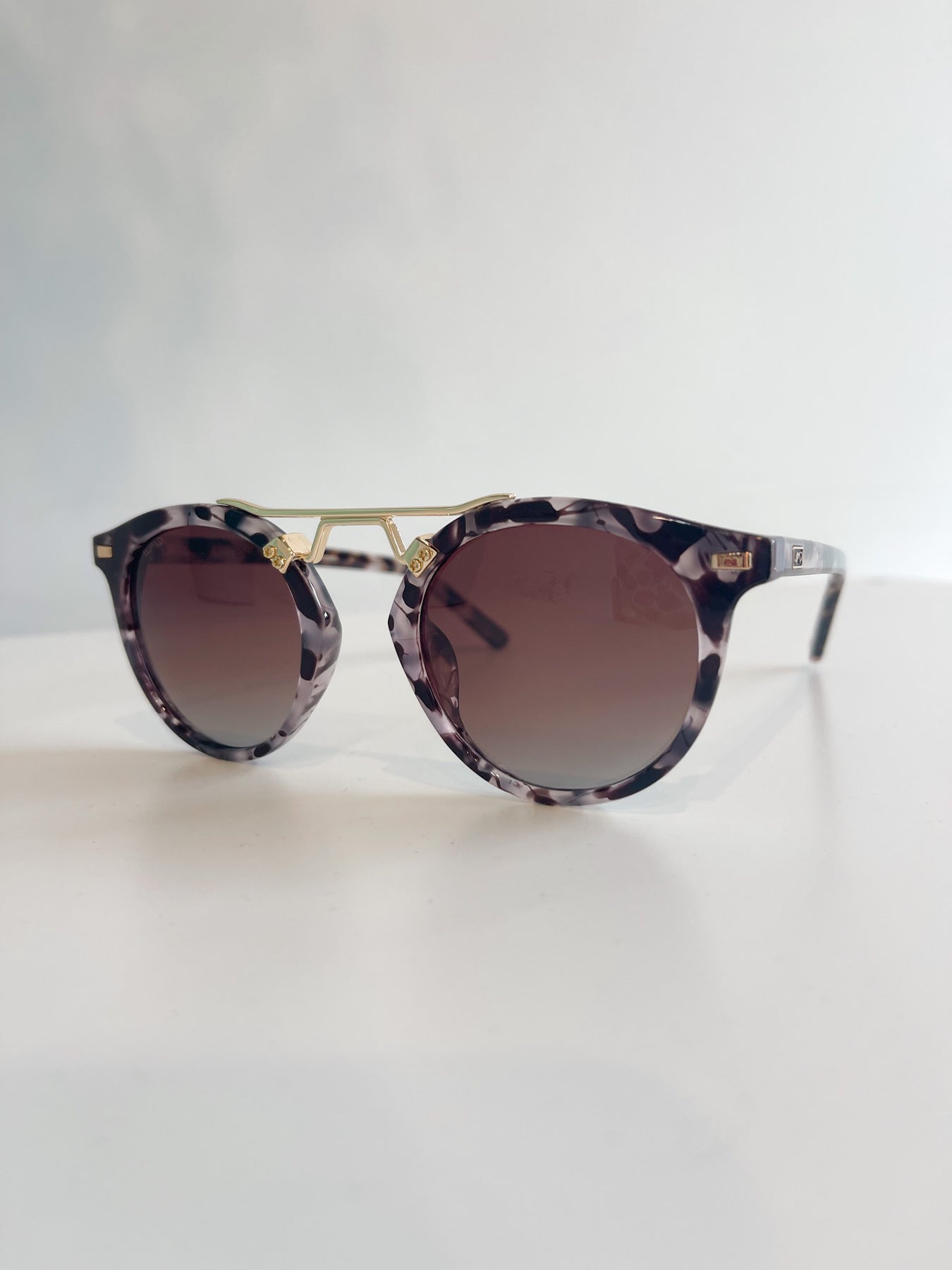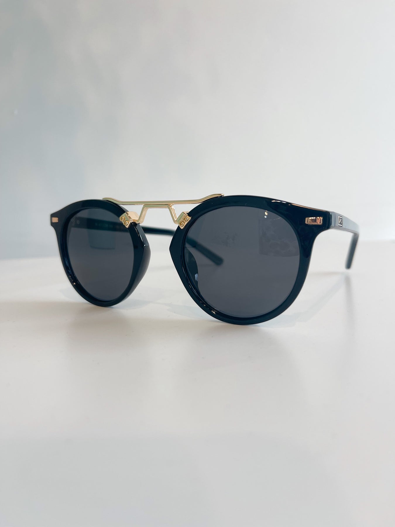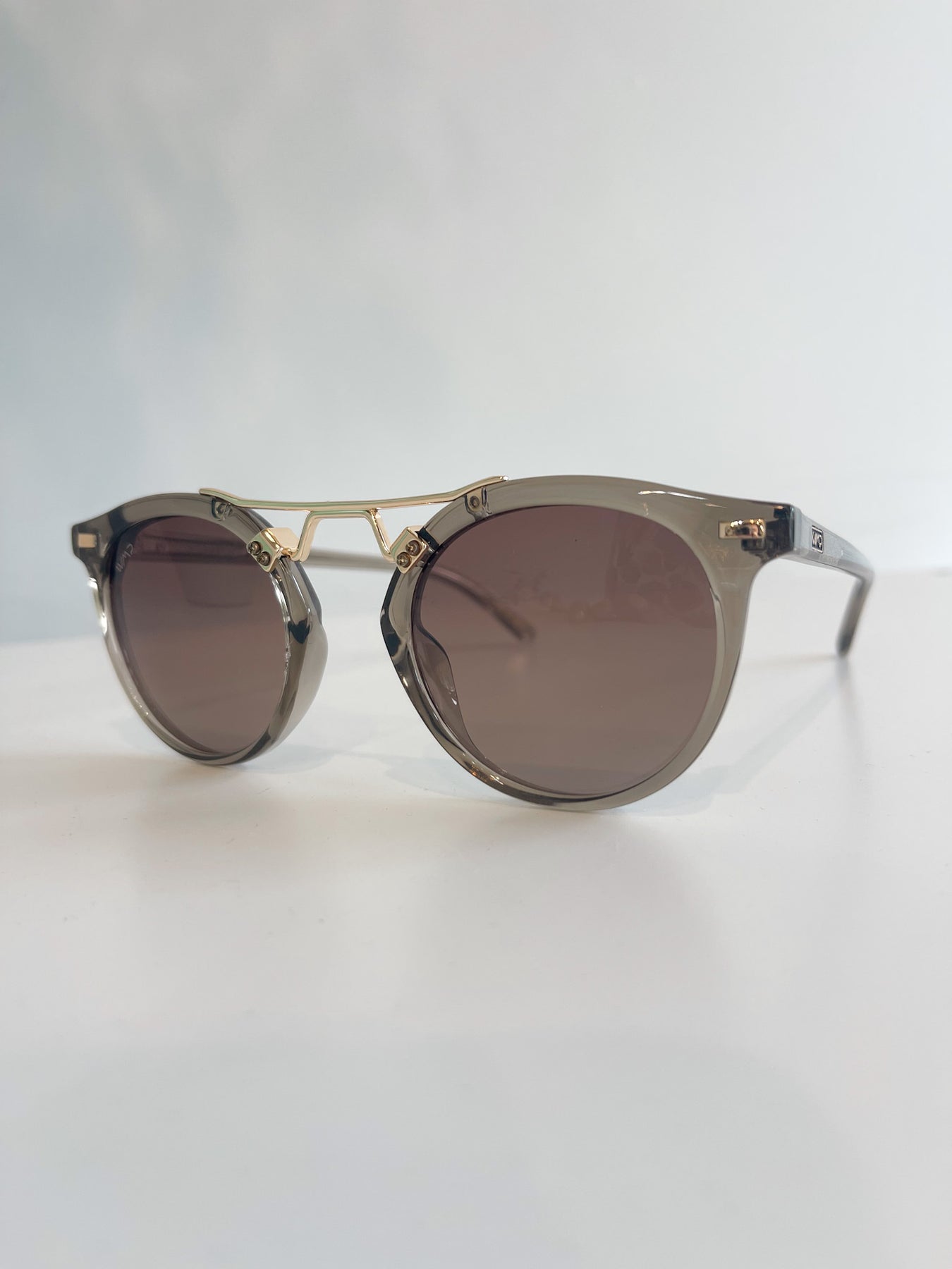 These WMP Eyewear sunglasses feature a modern retro-inspired silhouette with elevated details and bold frame finishes. The rounded lenses are paired with a distinctive gold-tone double bridge, giving them a sleek, fashion-forward look that blends classic and contemporary design.