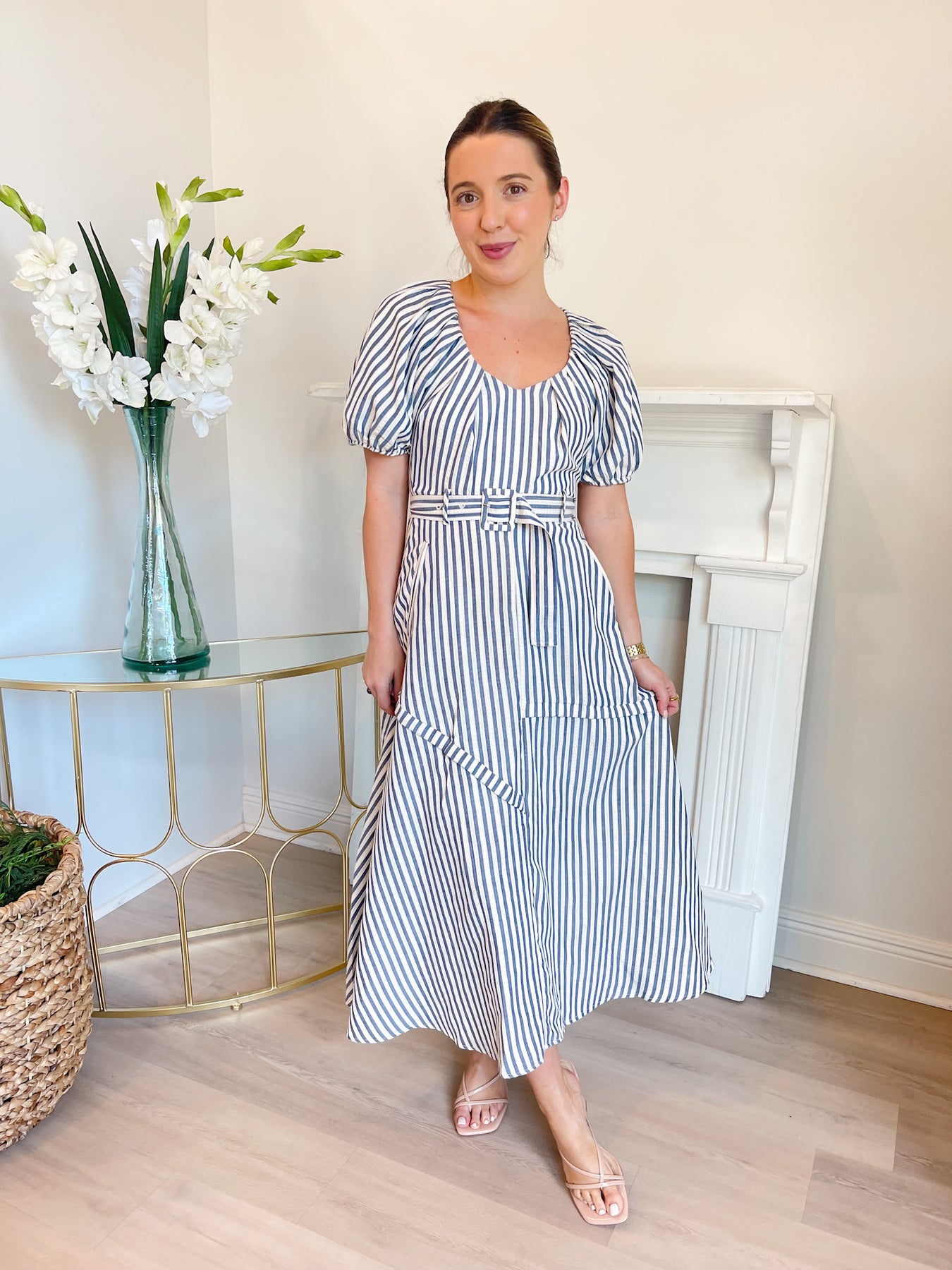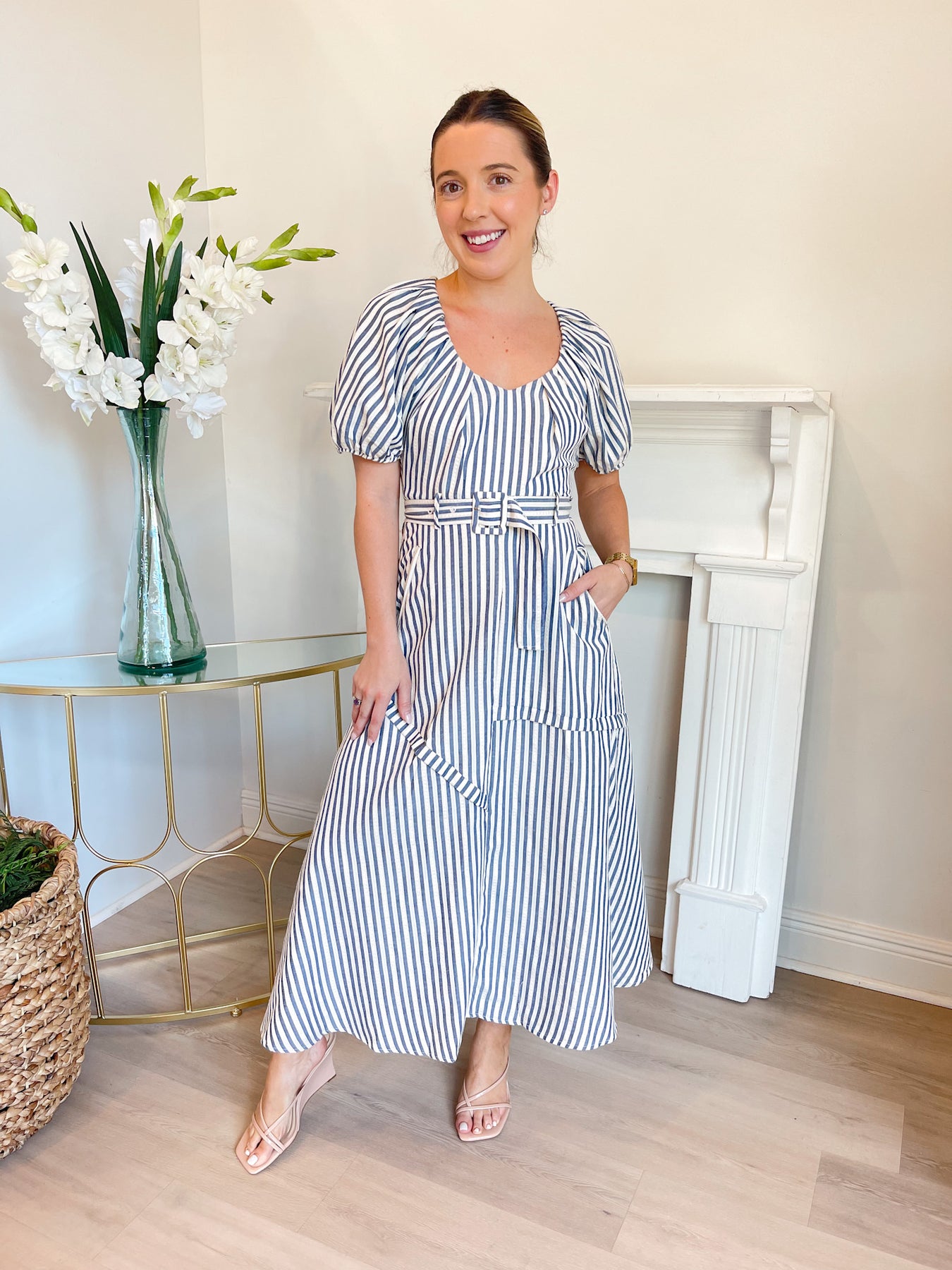 This dress is a breezy, classic midi with an effortlessly polished feel. It features a soft scoop neckline and short puff sleeves that add a touch of femininity, while the fitted bodice flows into a relaxed, A-line skirt. The blue and white vertical stripe pattern gives it a fresh, coastal-inspired look, elongating the silhouette.