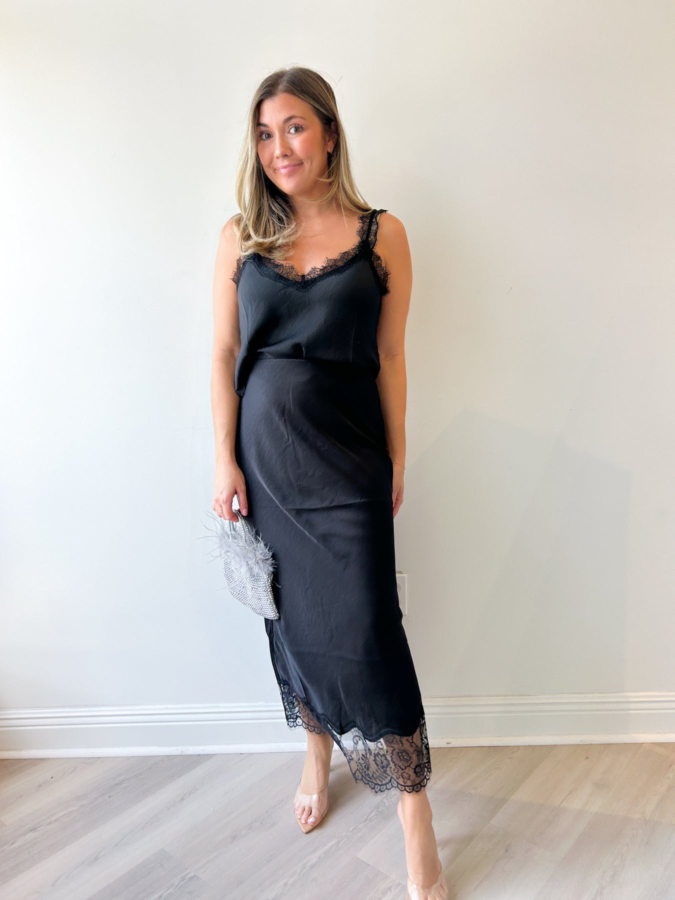 Crafted from smooth, lustrous satin, this high-rise midi skirt brings an elevated touch with a scalloped lace hem. The pull-on silhouette offers comfort and polish in equal measure, perfect for holiday dinners, cocktail hours, and everything in between.