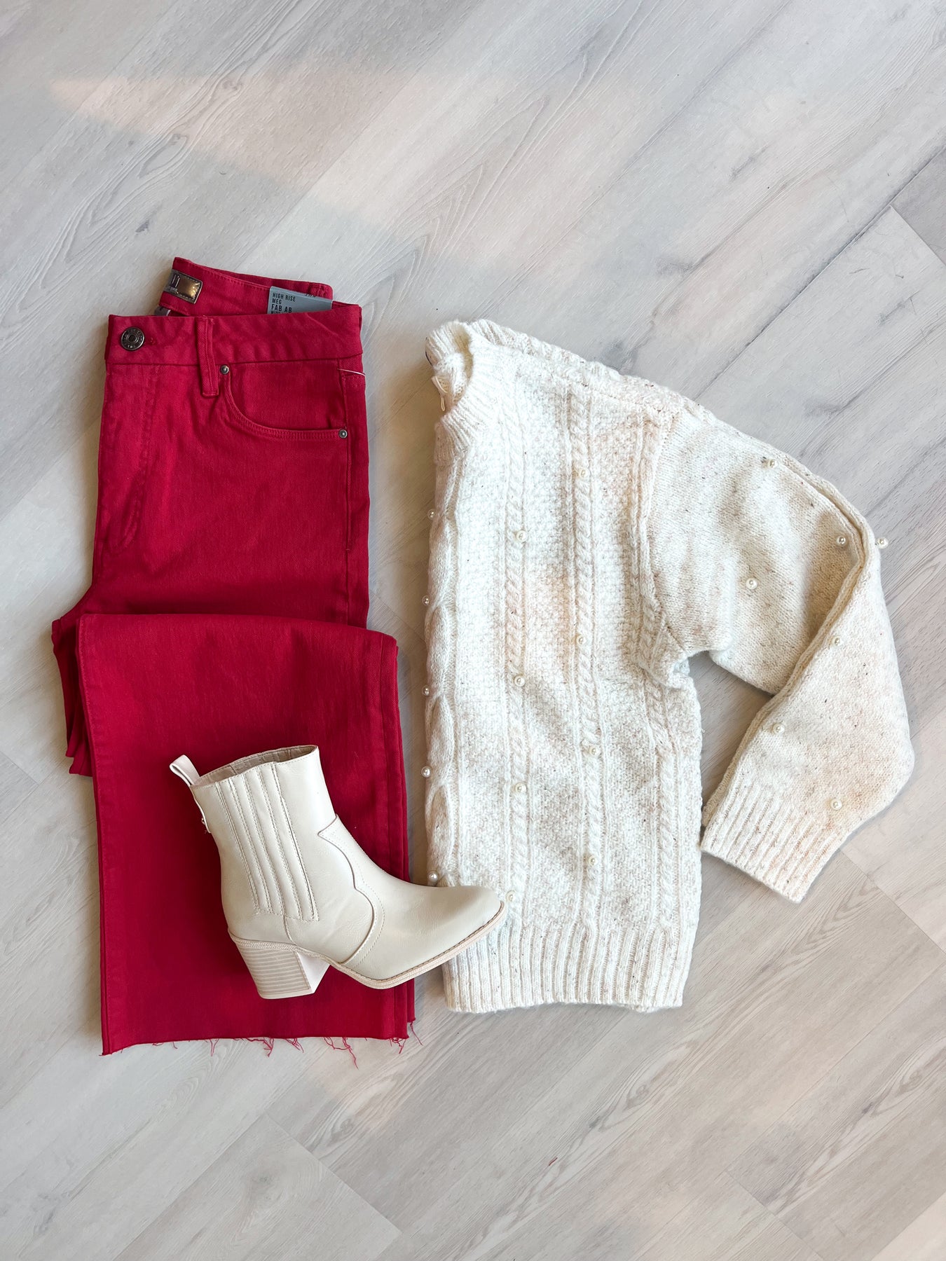 Elevate your cold-weather wardrobe with the Wynter Pearl Sweater, a timeless knit adorned with delicate pearl accents throughout. This soft, textured sweater blends classic cable detailing with a feminine twist, giving you the perfect balance of cozy and polished.
